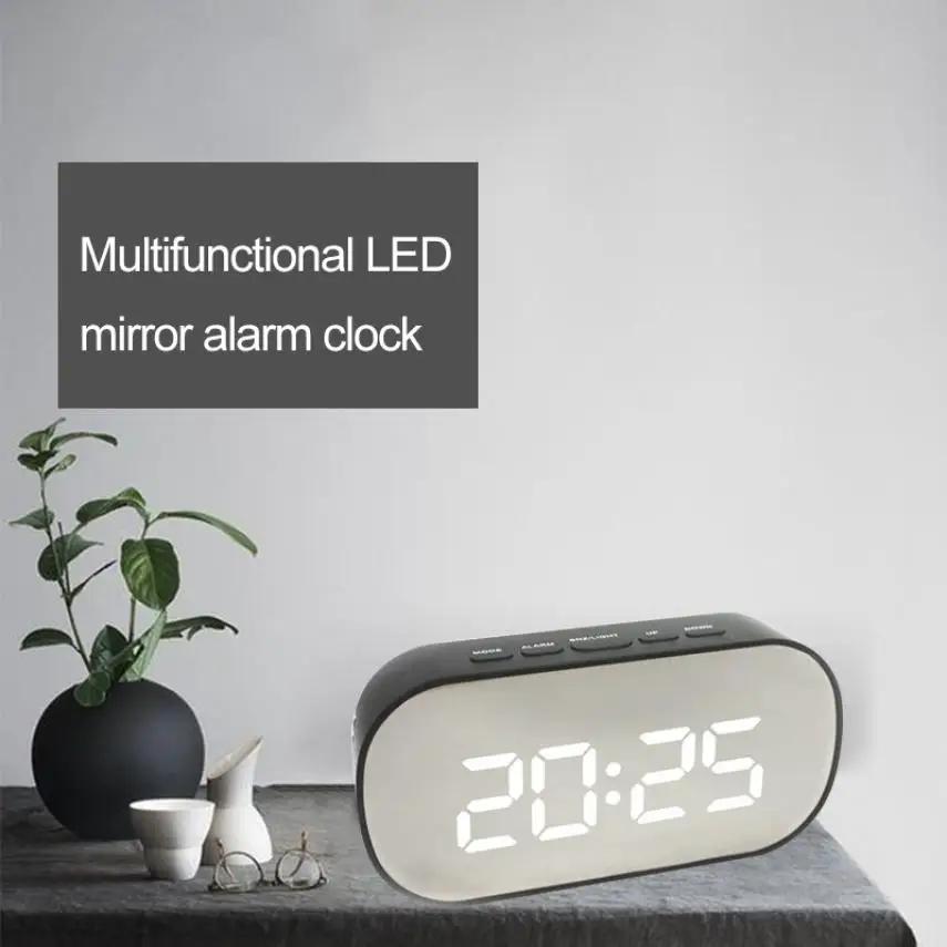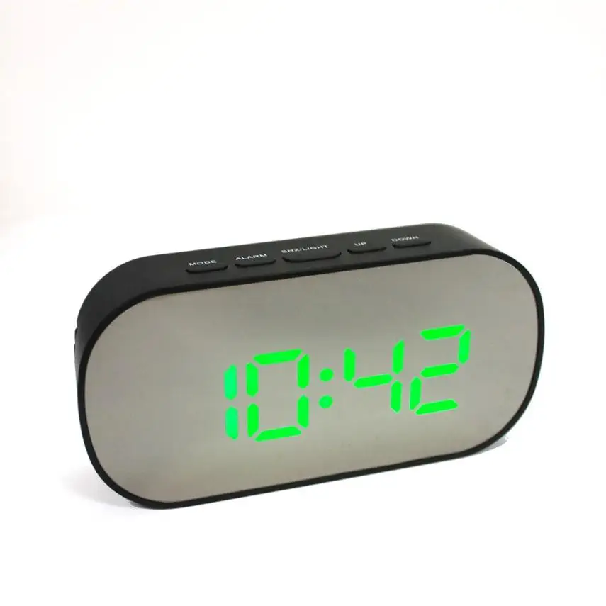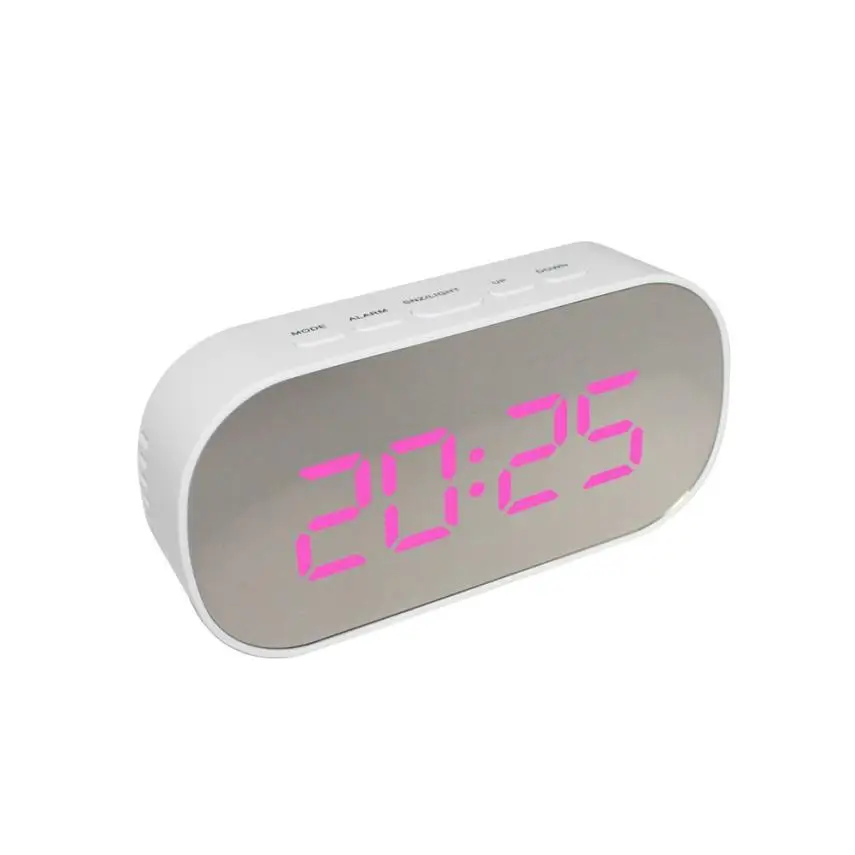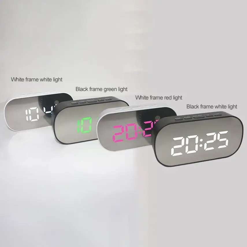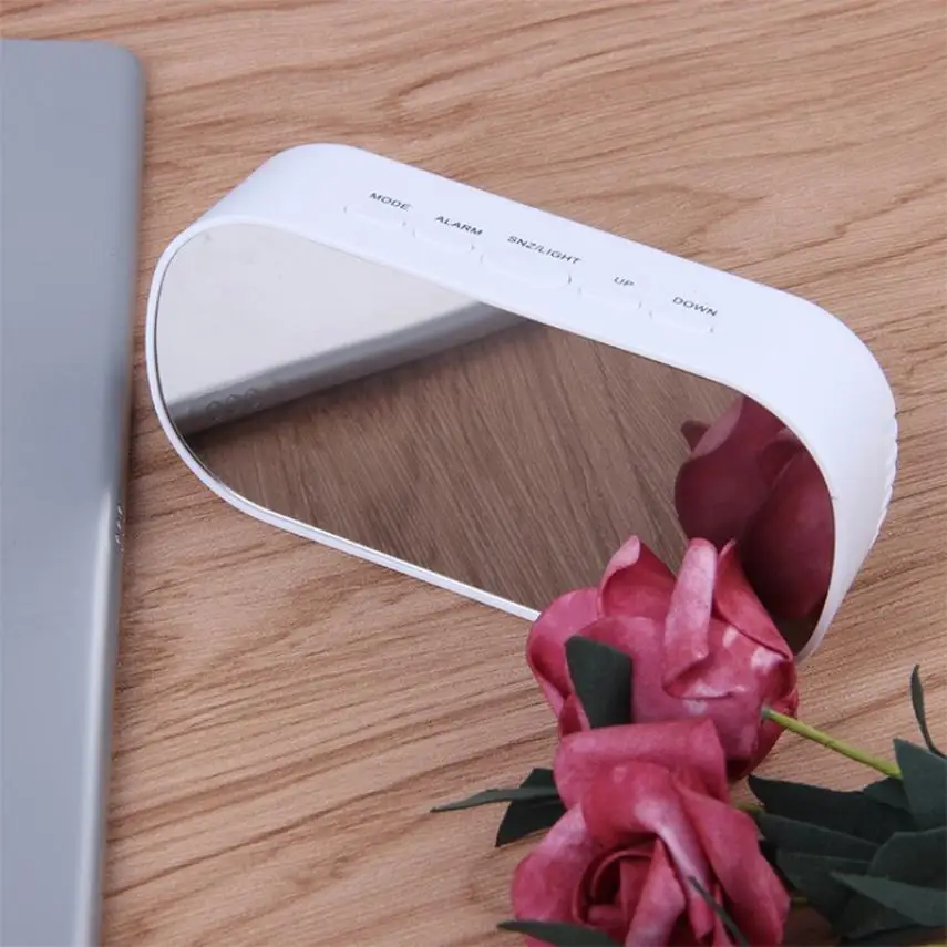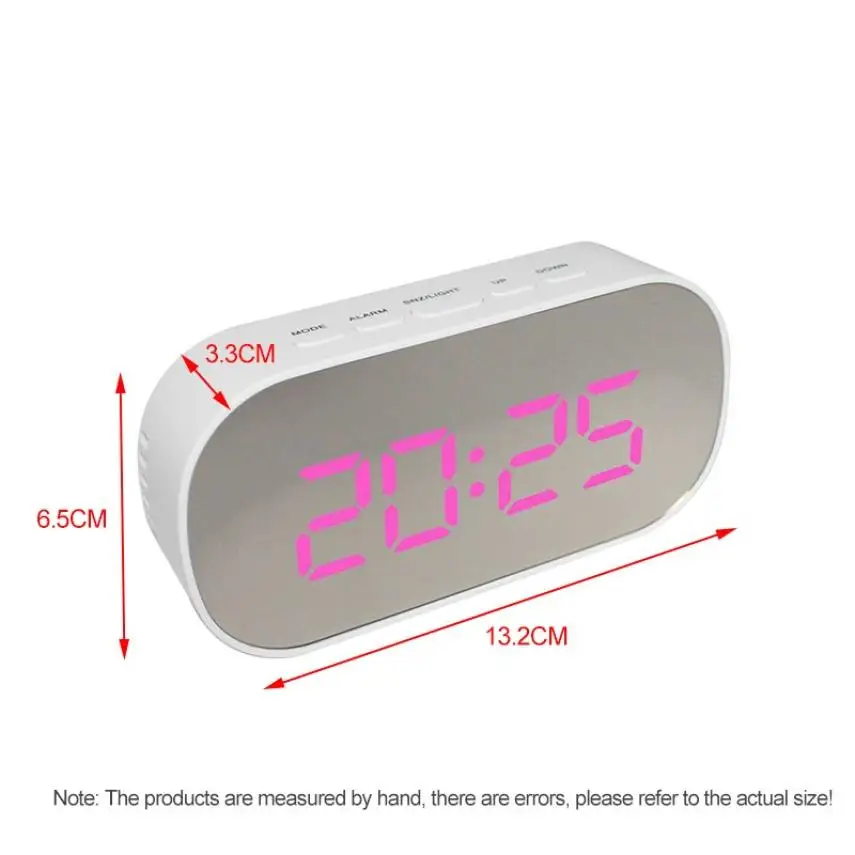 Название продукта: многофункциональный светодиодный зеркальный будильник часы Цвет: белая рамка белый светильник, белая рамка розовый светильник, черная рамка белый светильник, черная рамка зеленый светильник Материал корпуса: АБС-пластик Материал зеркала: стекло с покрытием Размеры: 13,2*3,3*6,5 см Вес: 170 г Источник питания: 3 батарейки AAA (не входят в комплект) Упаковка включает в себя: 1 * Будильник + 1 * USB кабель для передачи данных (в комплекте) + 1 * Инструкция