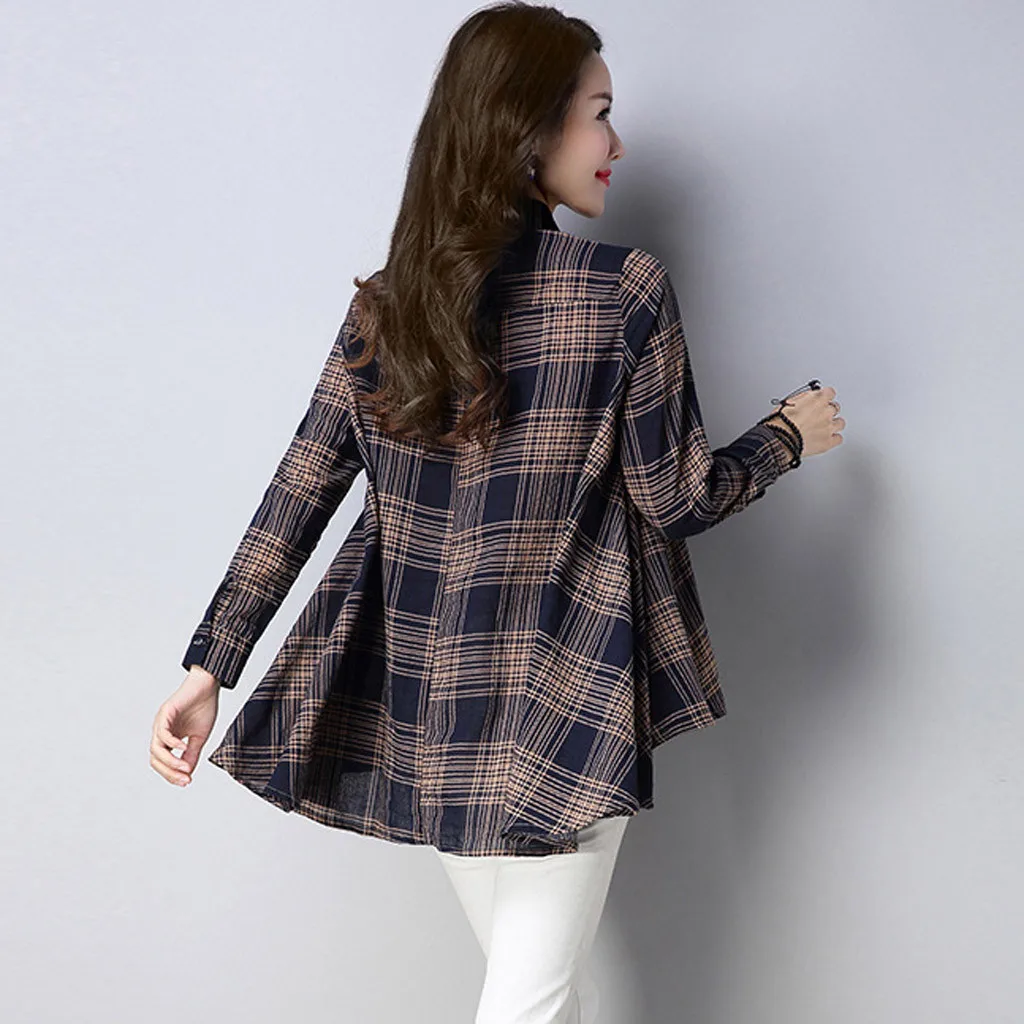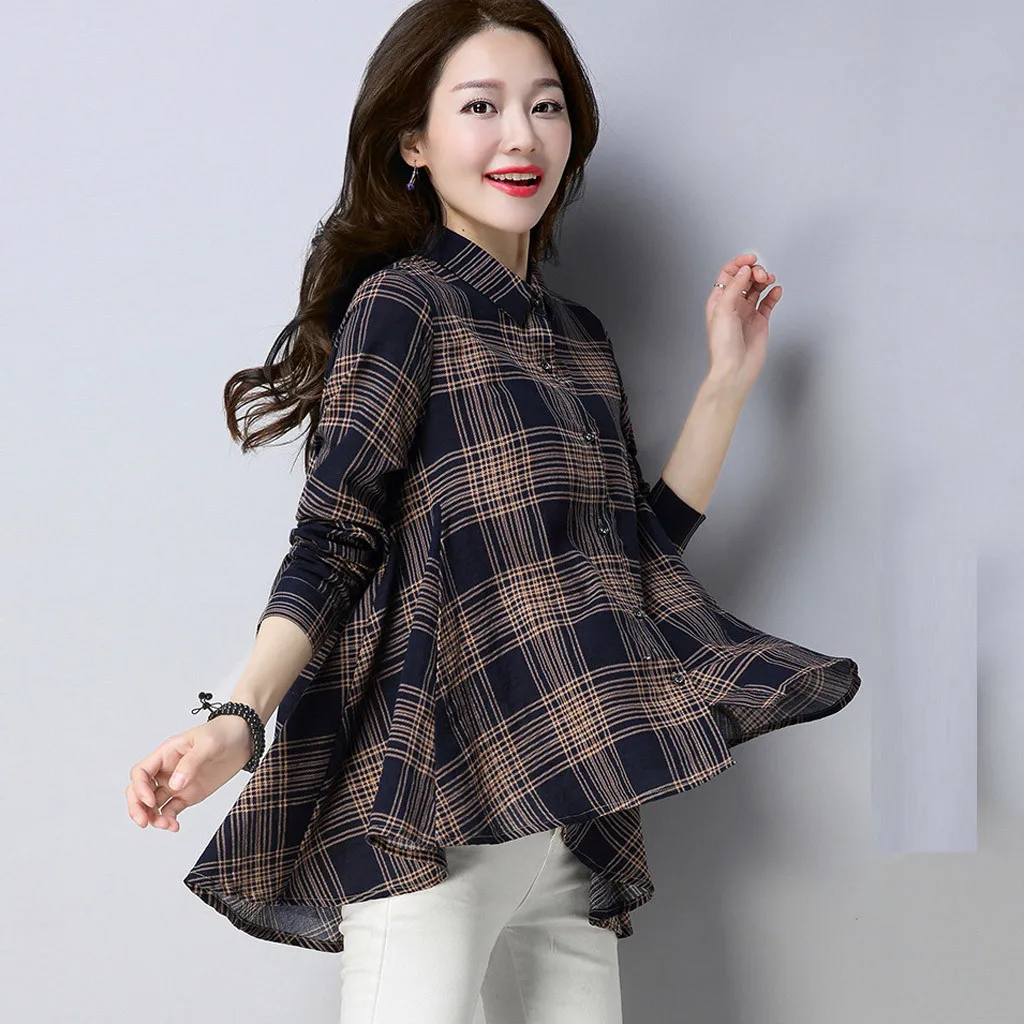 Chiffon Women Long Sleeve Butterfly Shirts Plaid O-Neck Button Casual Tops