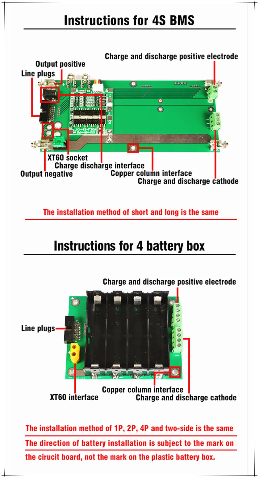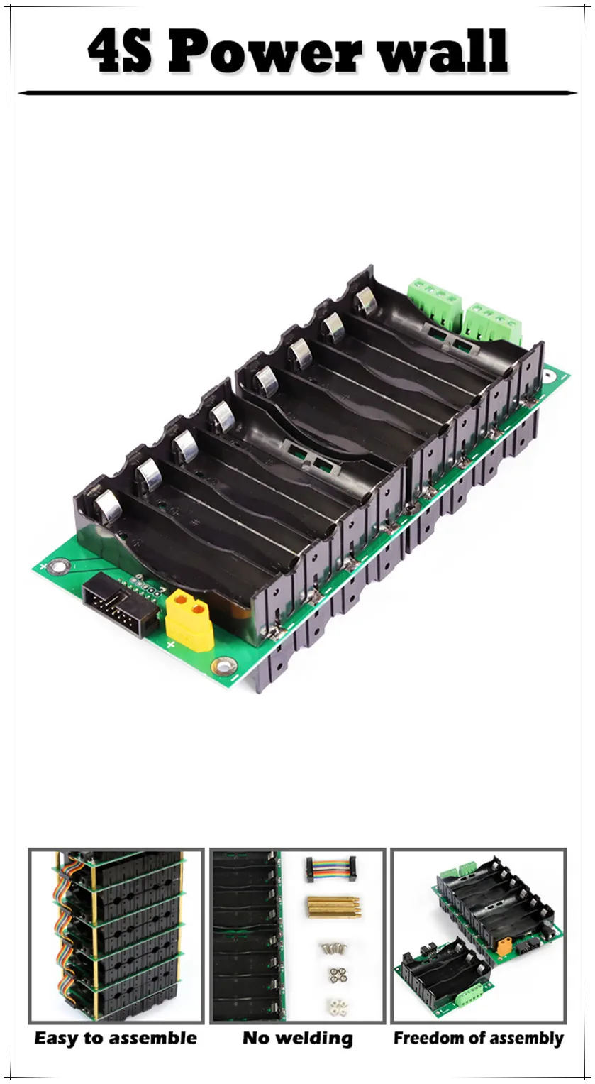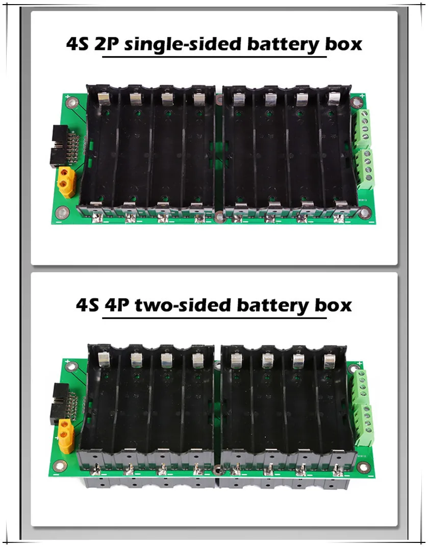 Перед тем, как Мы сконструировали аккумуляторную коробку 15 В, у нас было 3s12v, 6s24v, 7s29v, 17s 60v, 13s48v. Согласно исследованию рынка, многим инверторам необходимо 4 струны литиевых батарей для питания, а 3 нити литиевых батарей защитят их слишком рано и приведут к бесконечному разгрузке батареи. Самым большим преимуществом этого продукта является то, что он не продается. Он не нуждается в каких-либо припоя в тех случаях, когда он собран и б/у. Эта батарея состоит из 4, 8 или 16 батарей серии. Эти 16 батарей, соответственно, находятся на двух сторонах печатной платы, что может уменьшить объем, эффективно использовать площадь печатной платы, улучшать эксплуатационные характеристики и снижать стоимость. Например, 3000 мА на аккумулятор, макетная плата 4s1p заполнена 15 в 3 Ач, 4s2p-15 в 6 А, 4s4p-15 в 12 А · ч, И вы можете сложить любое количество аккумуляторных коробок в соответствии с вашими фактическими нуждами. У нас есть различные защитные пластины для вас, 40a, 80a, 120a, 120 ампер, что намного больше, чем 40 ампер с точки зрения объема. Но функции почти одинаковые, если нет особенно высоких потребностей в мощности, рекомендуется выбрать 40 А. Защитная пластина имеет функции защиты от зарядки и разрядки, защиты от разрядки тока, защиты от температуры, балансировки напряжения и импульса балансировки. Каждая печатная плата имеет 15а страховку, если батарея не работает, не влияет на другие батареи.