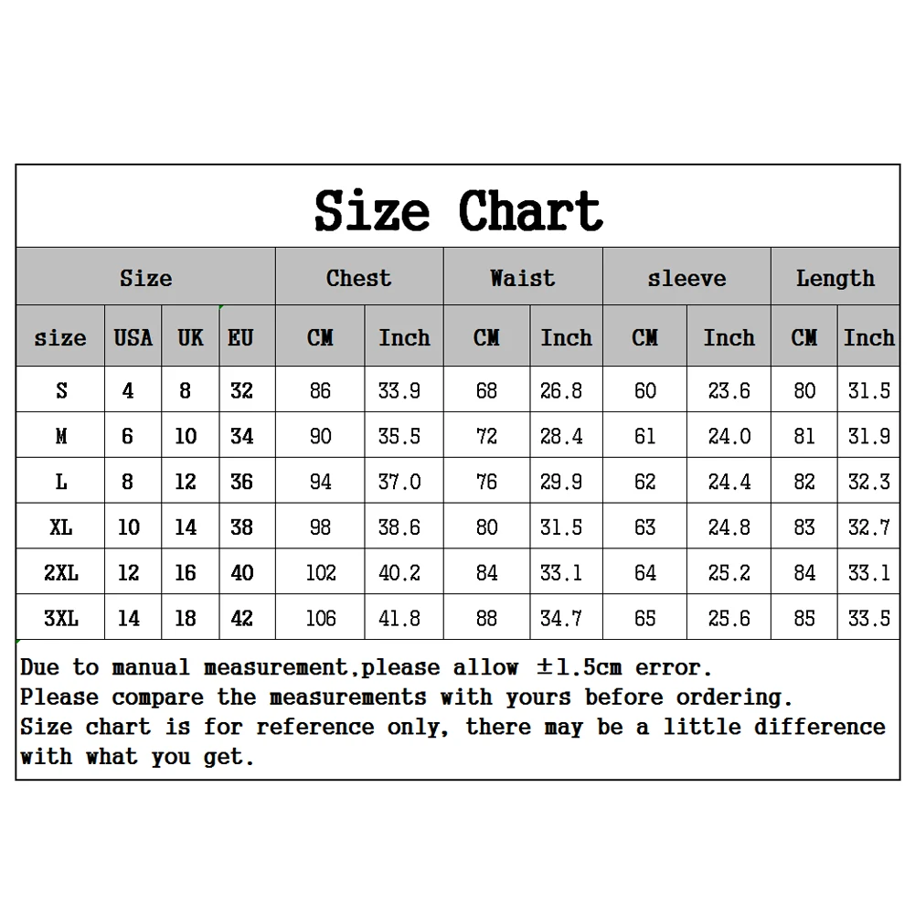[Наш Размер 3XL] Обхват груди: 106 см/41,8 ", обхват талии: 88 см/34,7'', длина рукава: 65 см/25,6 '', длина: 85 см/33,5'' (прибл.)