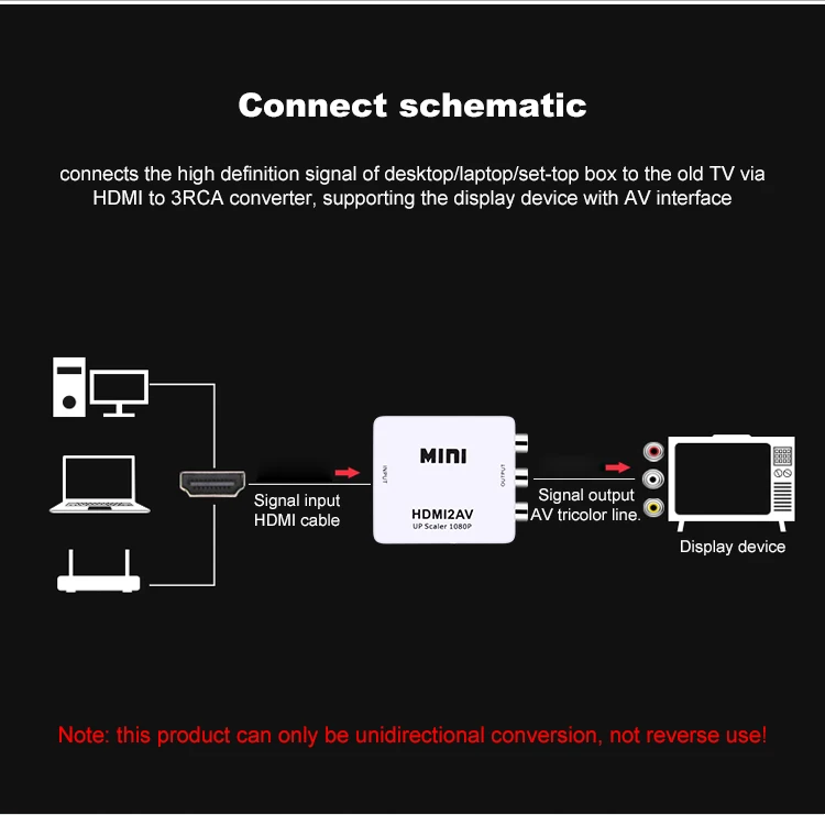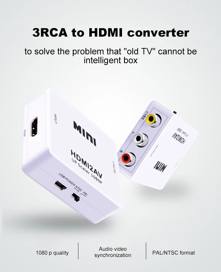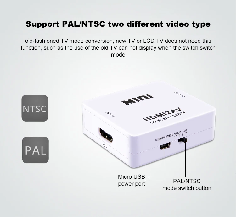 Мини-hdmi в AV преобразователь сигнала, который преобразует hdmi видео сигнал или аудио сигнал в AV (CVBS) композитный видео сигнал и FL / FR стерео аудио сигналы, в то время как Поддержка DVI системы sideline сигналы. Чтобы помочь пользователям изменить Высокое качество HDMI .. Видеосигнал в обычный CVBS сигнал (стандартное разрешение 480i, 576i,), так что можно воспроизводить на ТВ, VHS видеомагнитофон, DVD рекордеры, И т. Д. Также поддерживает NTSC и PAL два ТВ формата, как показано ниже: