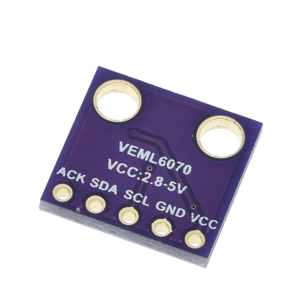 DESCRIPTION VEML6070 is an advanced ultraviolet (UV) light sensor with I2C protocol interface and designed by the CMOS process.It is easily operated via a simple I2C command. The active acknowledge (ACK) feature with threshold windows setting allows the UV sensor to send out a UVI alert message.Under a strong solar UVI condition, the smart ACK signalcan be easily implemented by the software programming. VEML6070 incorporates a photodiode, amplifiers, and analog/digital circuits into a single chip. VEML6070's adoption of FiltronTM UV technology provides the best spectral sensitivity to cover UV spectrum sensing. It has an excellent temperature compensation and a robust refresh rate setting that does not use an external RC low pass filter. VEML6070 has linear sensitivity to solar UV light and is easily adjusted by an external resistor. Software shutdown mode is provided, which reduces power consumption to be less than 1uA. VEML6070's operating voltage ranges from 2.7V to 5.5V.