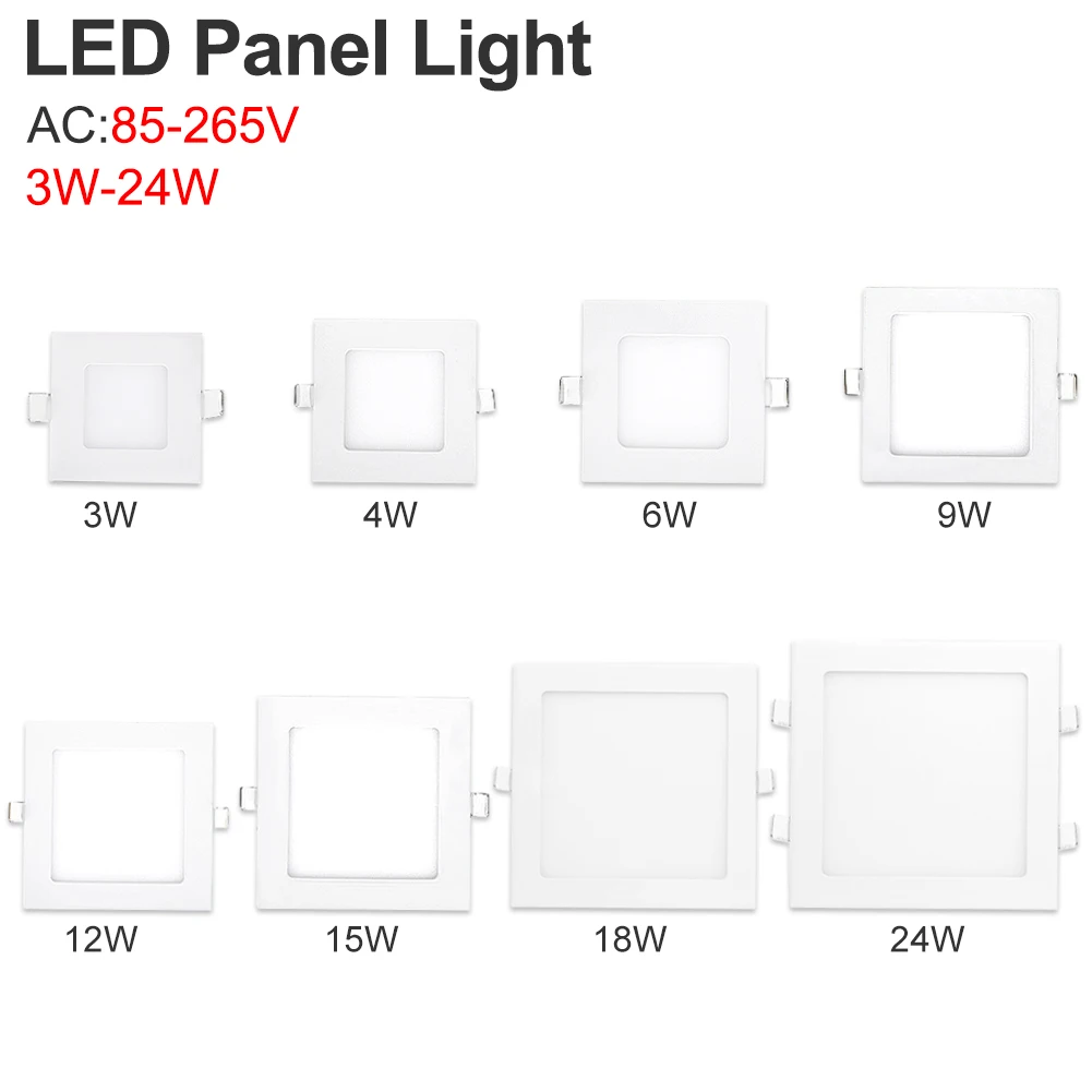 Особенности 100% Новинка! Светильник панели легко устанавливается и экологичен. Принимает высококачественные 2835 бусины внутри, достаточно яркие. Каждая панель светильник оснащен светодиодный драйвер, что обеспечивает безопасность и надежность, мгновенной старт и без мерцания. Технические характеристики Мощность:3/ 4/ 6/9/ 12/ 15/ 18 W/24W Чип: SMD2835 Материал: алюминий + акрил Форма: квадратная Напряжение: переменный ток85 ~ 265 в Светильник Цвет:Холодный белый6000-6500K,ТеплыйБелый 2800-3200K Сила света: около 100 (лм)/Вт (Чип на плате) Срок службы: 20000 часов Диммируемая:Нет Рабочая температура: -10 ~ + 40℃ Размер: около Ватт Количество бусин Внешний диаметр С резным узором Область применения 3 Вт 15 8,5 см 7,4 ~ 7,8 см ≤2㎡ 4 Вт 20 10 см 9,4 ~ 9,7 см ≤2㎡ 6 Вт 30 11 см 9,4 ~ 9,7 см ≤4㎡ 9 Вт 45 15 см 13,3 ~ 13,7 см ≤6㎡ 12 Вт 60 17,3 см 15,3 ~ 15,8 см ≤8㎡ 15 Вт 75 19,4 см 17,8 ~ 18,2 см ≤10㎡ 18 Вт 90 22,5 см 20,6 ~ 21,1 см ≤12㎡ 24 Вт 120 29,2 см 27,6 ~ 28,1 см ≤14㎡ Внимание 1. Замеры сделаны вручную, поэтому возможны около 0,3 см размер отклонения из-за размеров человеческого тела! Посылка в комплекте 1 X светодиодный светильник (с драйвером)