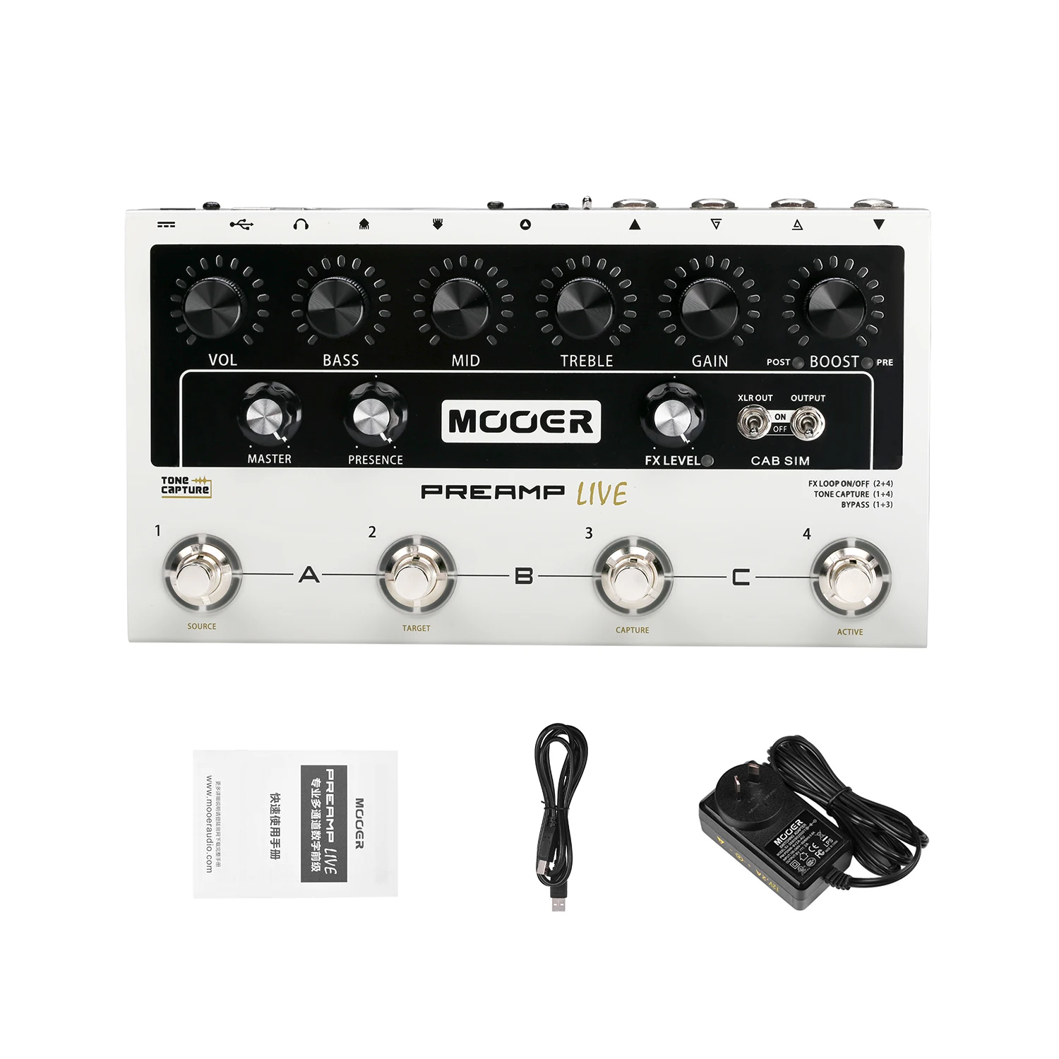 Преамп LIVE обеспечивает широкий спектр различных оттенков amp прямо у ваших ног. Он позволяет Вам выбрать и переместить 12 независимых предварительных каналов по вашему выбору, из 50 моделей, доступных в поддерживающем программном обеспечении и мобильных приложениях. К каждому из 12 предусилителей добавлен усилитель двойного положения, регулируемые предварительные и постошумные шлюзы, полностью программируемый цикл эффектов с различными режимами, полноканальное управление переключением, вход и выход миди, специальное подключение наушников, несколько выходов с дополнительной симуляцией кабины и возможностью ИК-загрузки. Цикл эффектов в режиме предварительного повышения в реальном времени имеет уникальный режим a/B, который позволяет использовать аналоговые предварительные усилители вместе с цифровыми моделями. Если этого недостаточно, вы также можете использовать функцию «тональный захват» MOOER, чтобы пробовать собственную секцию предварительного усилителя и создать совершенно новые цифровые модели для вашего собственного использования в gigs и делиться с друзьями.