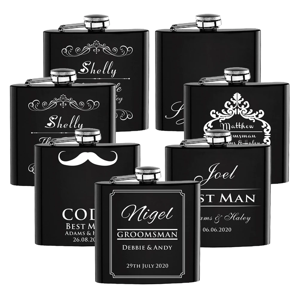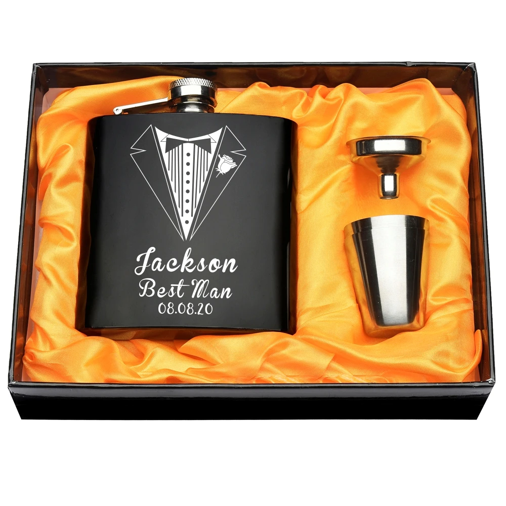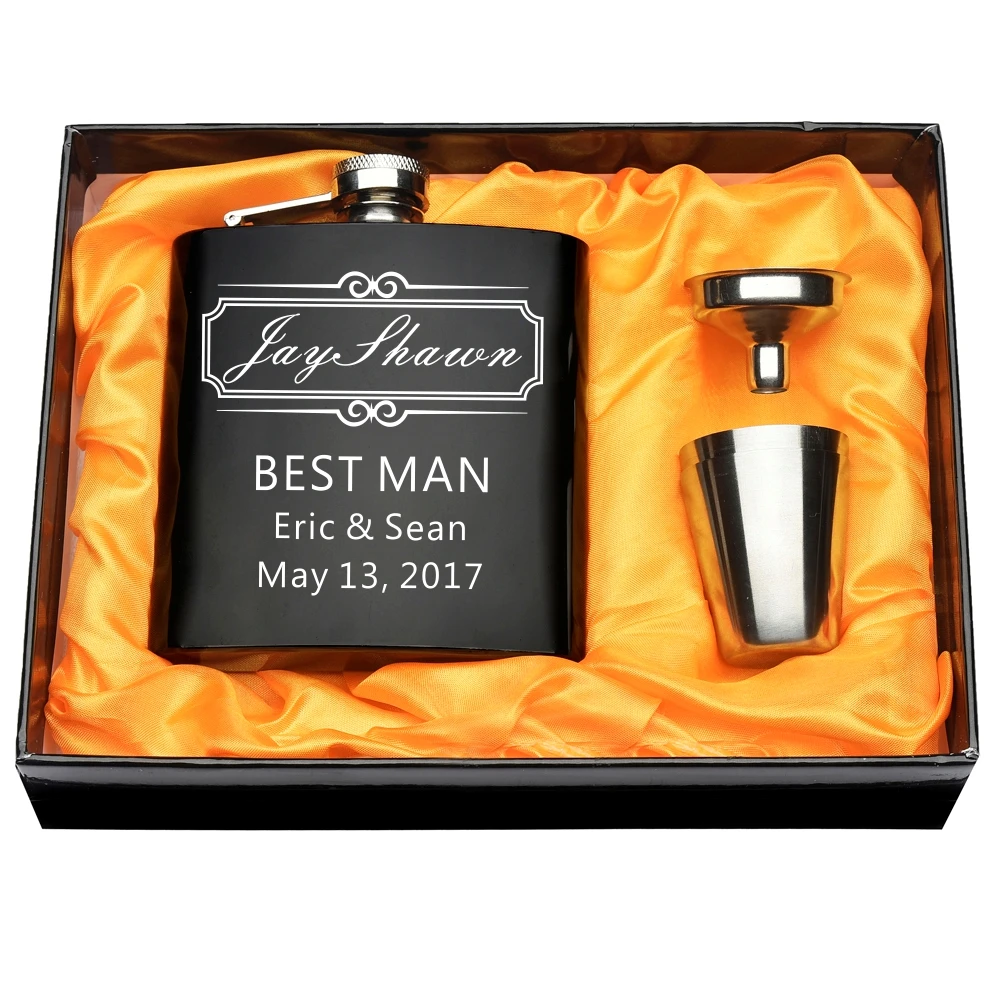 Персонализированные 6 унций из нержавеющей стали фляга с подарочной коробкой Материал: 18/8 нержавеющая сталь/степень еды/безопасность Фляга захвата: 95x22x110 мм 6 унций = 170 мл Фляга-1 шт. (1 шт.): xxx Линия 2:xxx Линия 3:xxx И так далее