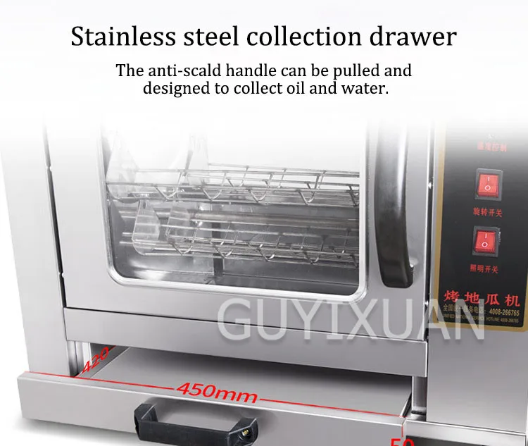 Название продукта: электрическая плита для сладкого картофеля на гриле Модель изделия: 88 (изоляция) Номинальное напряжение: 220 В Температура регулирования: нормальная температура-300 ℃ Номинальная мощность: 2000 Вт Характеристики подвесной корзины: 335*85 мм Количество подвесных корзин: 8 Внутренний диаметр ящика: 450*420*50 мм Характеристики продукта: 620*460*880 мм Вес изделия: 32 кг Материал подкладки: алюминиевый сплав Способ нагрева: электрическое Отопление труб Ёмкость: 40L Примечание: закаленное стекло используется при высокой температуре и не должно касаться влажных полотенец или других низкотемпературных предметов, в противном случае закаленное стекло мгновенно разобьется в физическом феномене теплового расширения и сжатия.