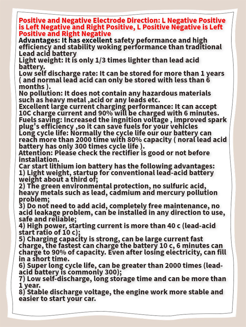 Длительный срок службы: как правило, срок службы нашей батареи может достигать более 2000 раз со 100% емкостью (свинцово-кислотная батарея noral имеет всего в 300 раз срок службы).