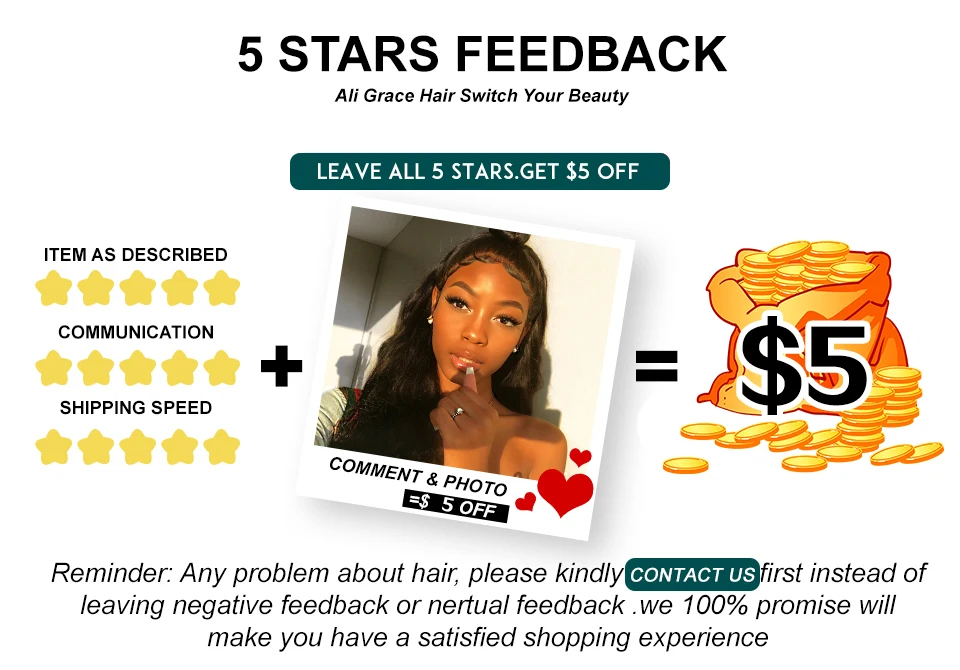 Мы очень ценим ваш товар, если вы оставите нам положительный отзыв с 4 или 5 звездами и 4-5 картинками. Ваш хороший обзор-это большая поддержка для наших трудолюбивых сотрудников. Из-за благодарности мы отправим вам 5 долларов. Если вы не удовлетворены полученным товаром, пожалуйста, свяжитесь с нами, прежде чем оставить отрицательные отзывы. Мы хотели бы работать с вами, чтобы решить любые проблемы.
