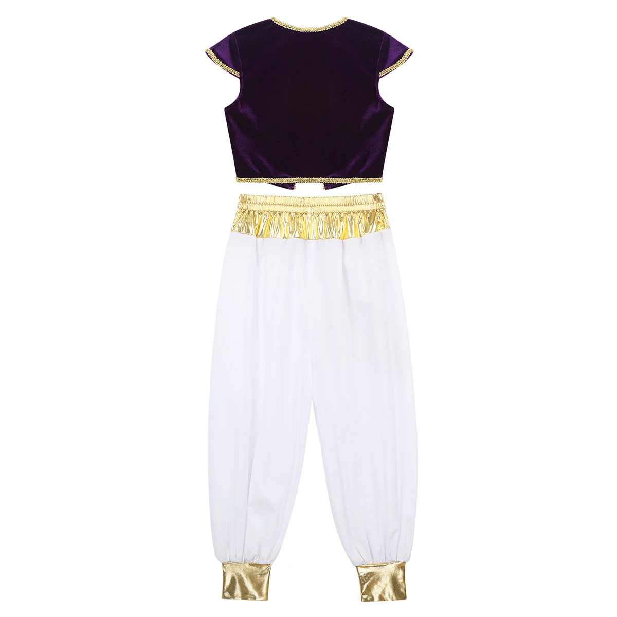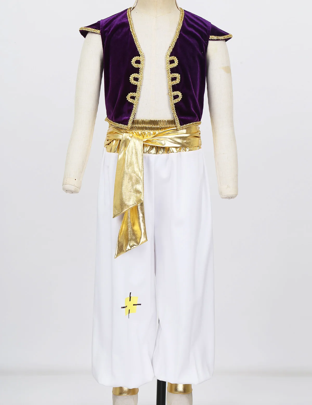 Костюм изготовлен из полиэстера и плотного материала, рекомендуется ручная стирка. Таблица размеров означает возрастные диапазоны для мальчиков, но они предназначены только для общего ознакомления. Рукава-крылышки, открытый пурпурный жилет, украшенный золотой плетеной отделкой. Мягкая ткань, удобная для ношения. Подходящие брюки с металлическим поясом и манжетами, эластичный пояс с самозавязывающимся поясом. Правое колено с принтом. Подходит для Хэллоуина, карнавала, косплея, темативечерние, ролевых игр, нарядов, фотографий, праздников и т. д.