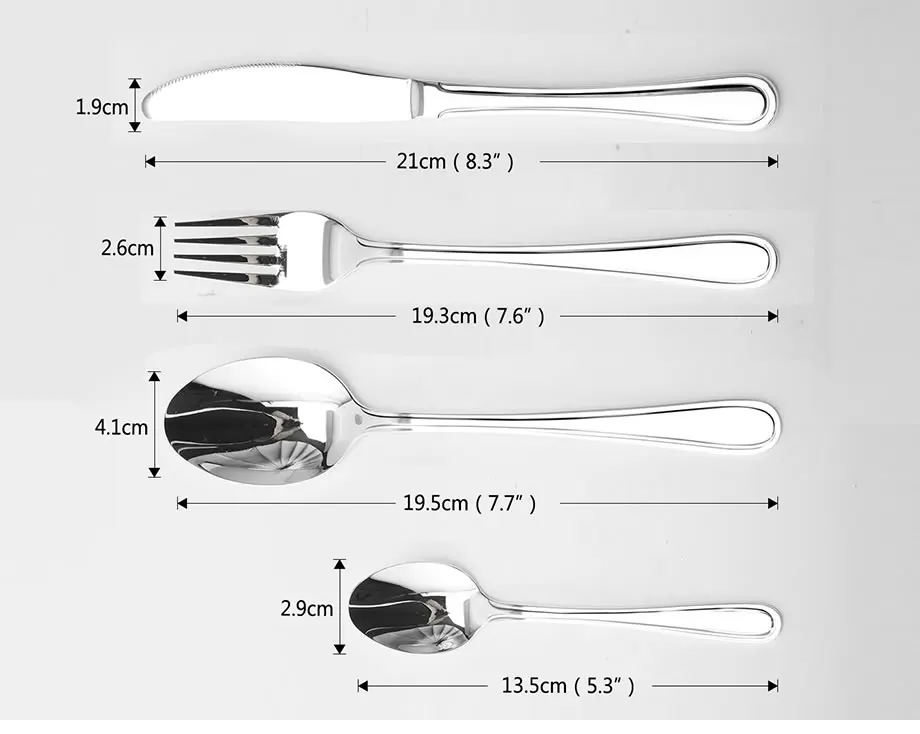 Нож для стола: 21*1,9 см, вилка для стола: 19,3*2,6 см, Столовый прибор ложка: 19,5*4,1 см, Чай ложка: 13,5*2,9 см