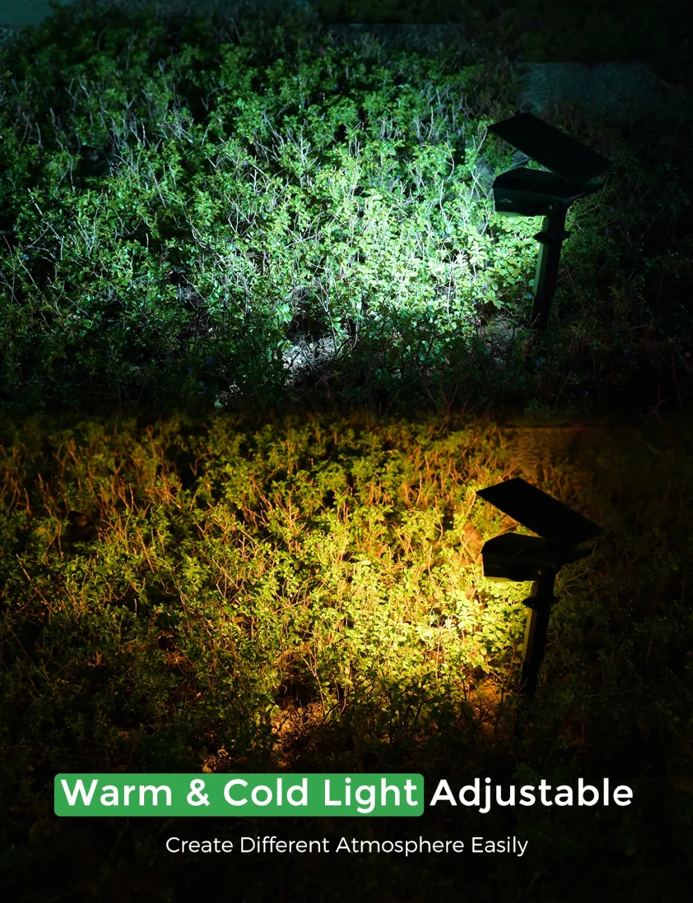 Двойная Цветовая температура:Принимая во внимание, что конечный визуальный эффект полностью отличается от разной цветовой температуры, облученной на одном и том же объекте, мы разработали новейший Солнечный Точечный светильник s, чтобы быть теплым и холодным светильник, регулируемый. Эффект lightitng может быть изменен на то, что вы хотите, не покупая новый солнечный светильник.