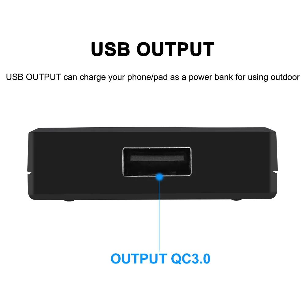 Выход USB может заряжать ваш телефон или планшет как внешний аккумулятор для использования на открытом воздухе. Вход постоянного тока