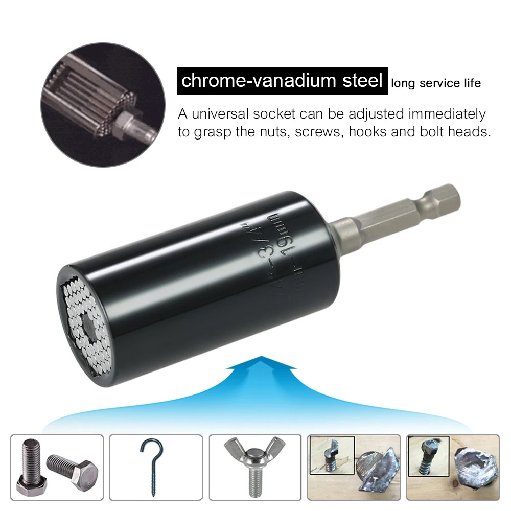 Универсальная Розетка использует профессиональный дизайн привода, который позволяет работать с различными размерами крепежей, будь то метрические или стандартные. Он обеспечивает работу с различными формами-шестигранными и квадратными крепежами, крючками и даже ржавевыми и поврежденными гайками и болтами, просто положите гнездо на застежку и перейдите к работе.