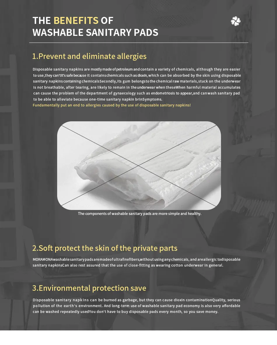 Suitable for the night with less flow, reusable, washable cloth sanitary pad, can save a lot of cost for life, super absorb the inner layer of microfiber, keep the skin dry, bamboo charcoal can be reused to eliminate odor, pul layer, to prevent leakage, can keep up to 10 hours, it is recommended to replace the pad every 2-6 hours