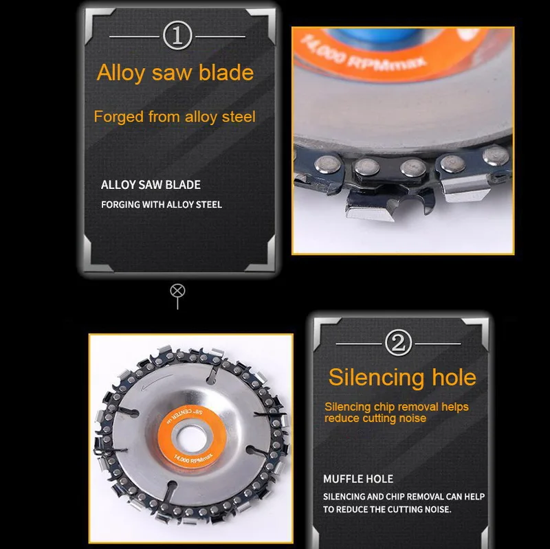 2. Шлифовальная дисковая цепная пила принимает мышечные работы из резки, резьбы, удаления и скульптуры дерева, пластмассы, льда и твердой резины с их скоростью и маневренностью.