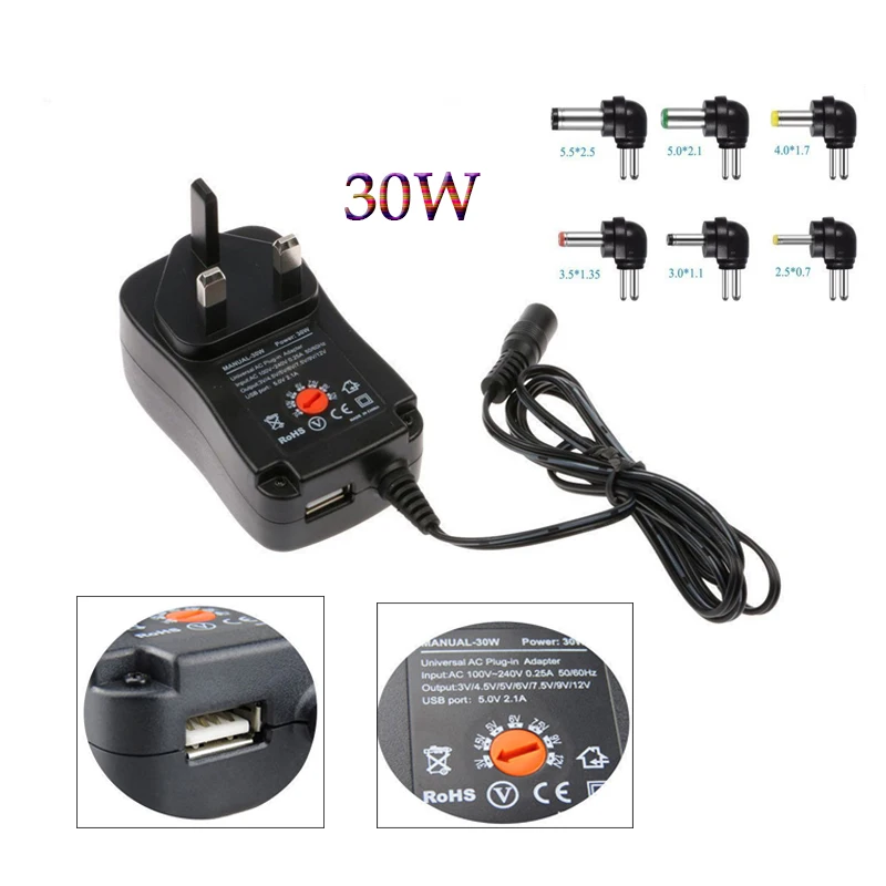 Этот адаптер на выходе составляет 3 В/4,5 В/5 В/6 в/7,5 В/9 В/12 В. Вы можете легко установить напряжение с помощью маленькой кнопки, которая включает адаптер.