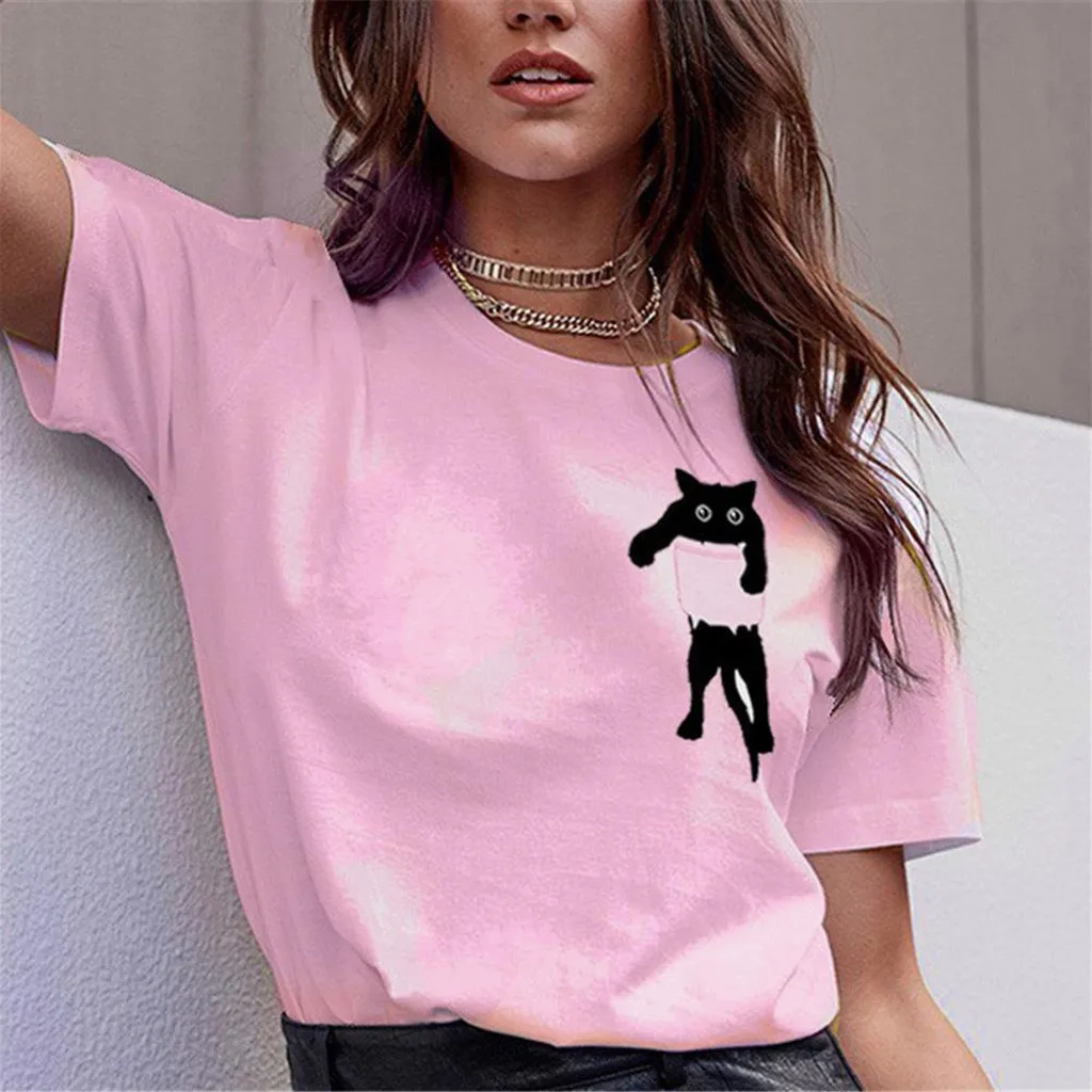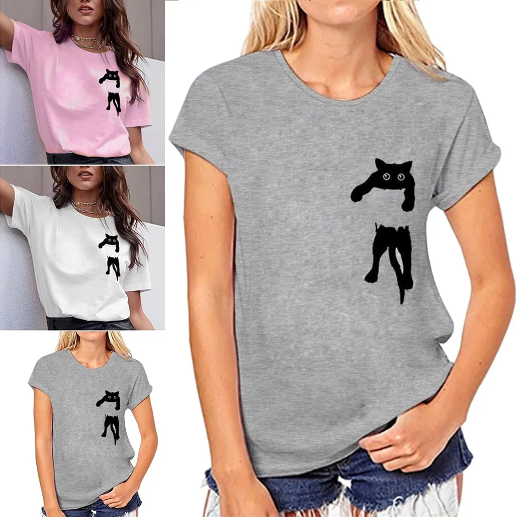 Женская футболка с принтом кота, свободная блузка с коротким рукавом, повседневный простой пуловер, топы