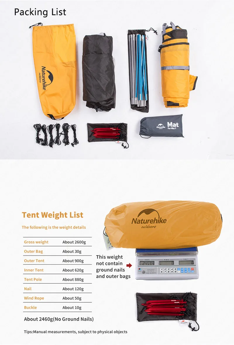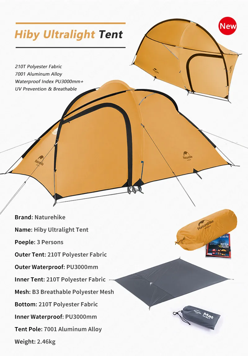Hiby 3 палатки вес: 20D нейлон покрытием силикона 3,2 кг (включая упаковку)/210 T полиэстер ткань 2,88 кг (без гвоздей)
