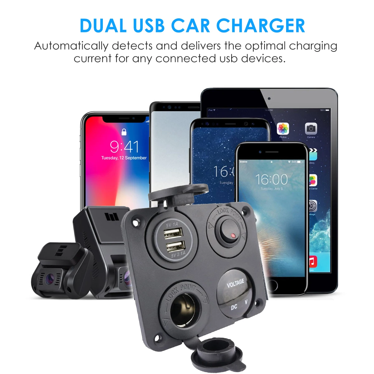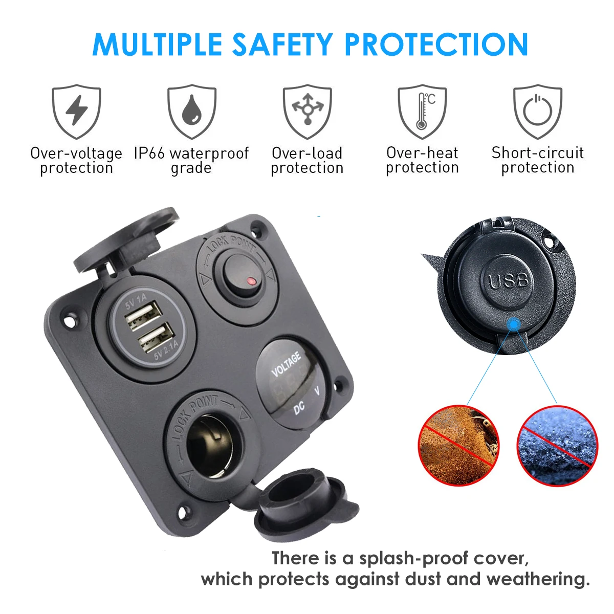 Материал: АБС-пластикВыход разъема USB: 5 В 1A + 5 В 2.1AВыход питания: 12 В постоянного токаДиапазон отображения вольтметра: 9 - 24 ВВходное напряжение: 12-24 ВРазмер: 104 мм * 87 мм * 35 ммЦвет: красный светильник | Синий светильник | ЗеленыйПосылка включает в себя: