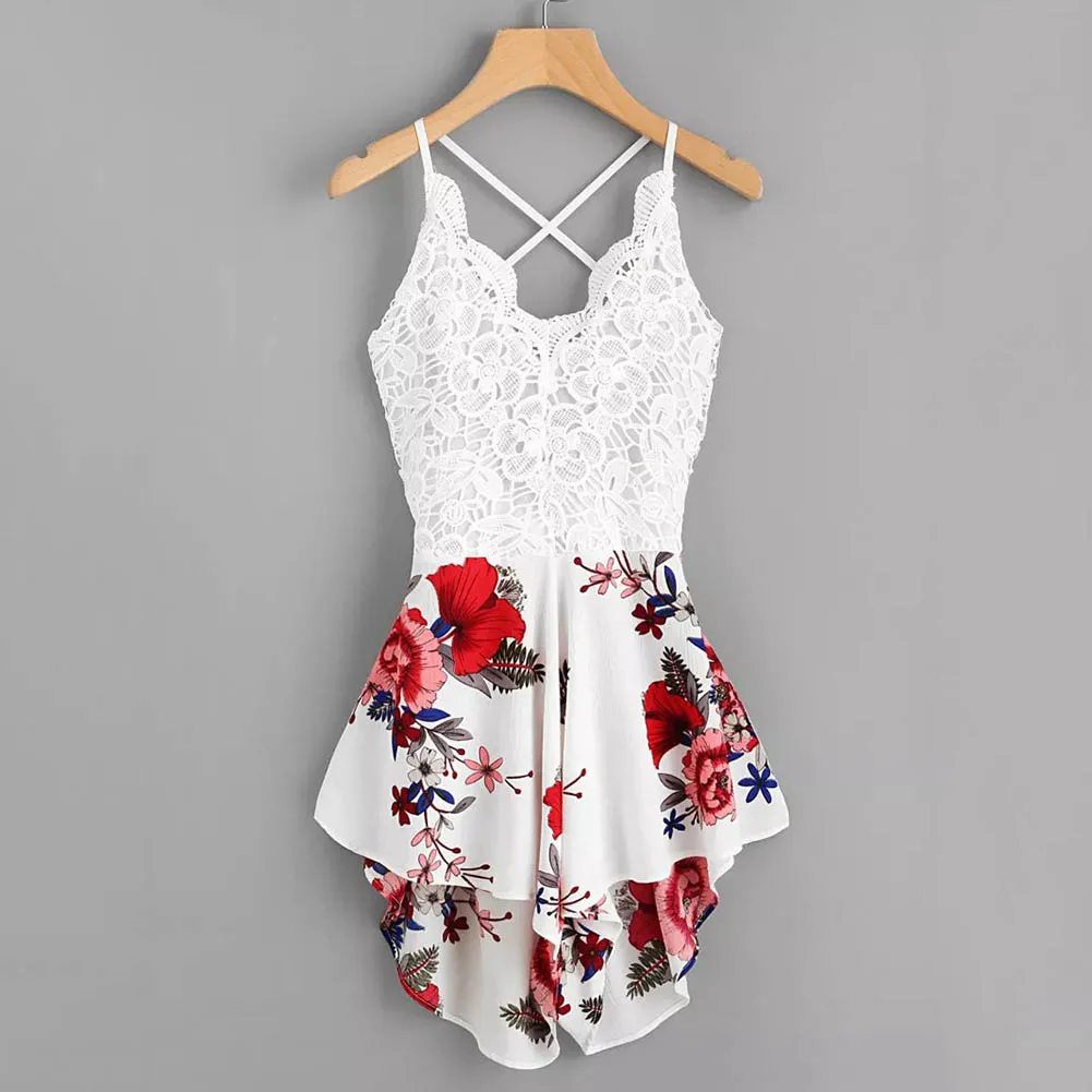 Летний женский кружевной комбинезон без рукавов с цветочным принтом и открытой спиной