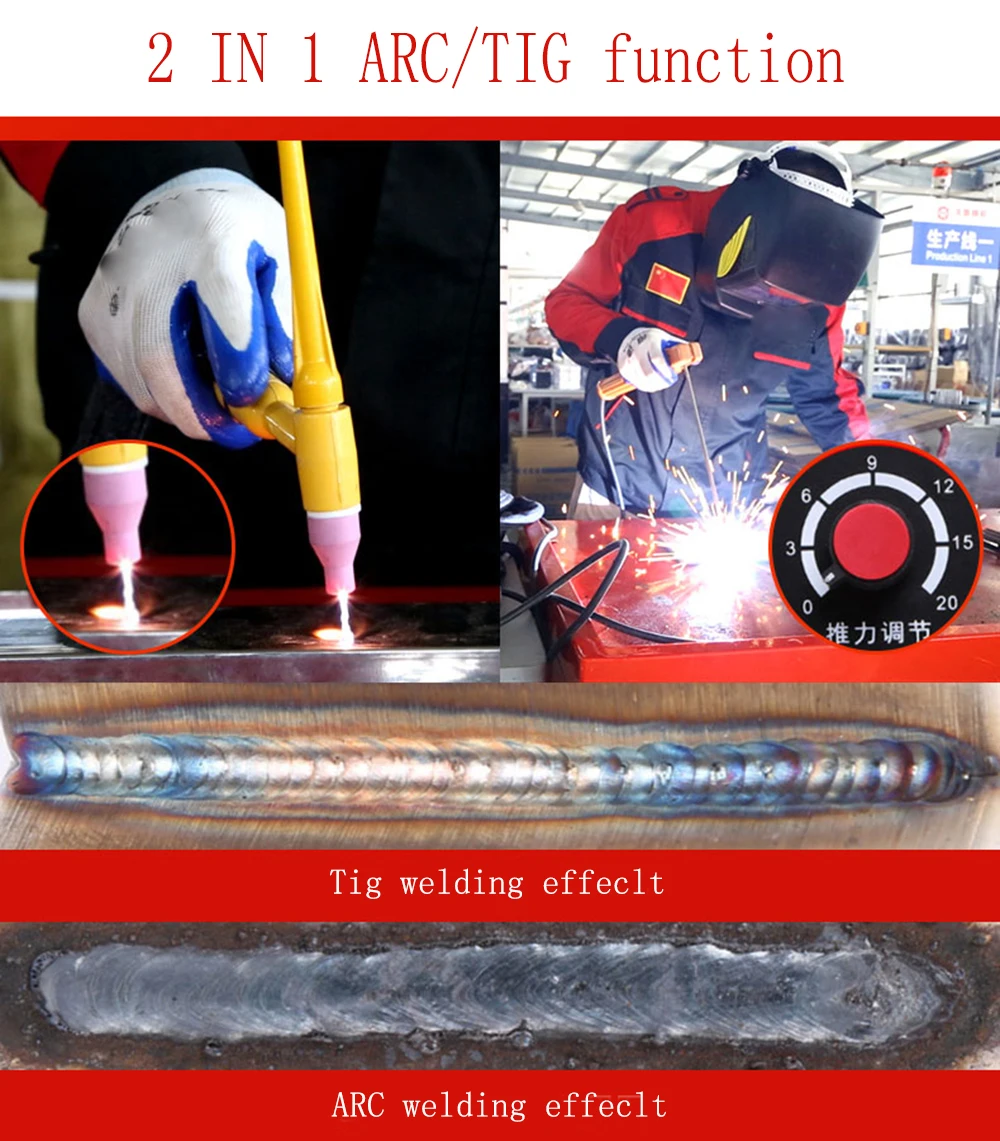 Specifications: Name: TIG / Arc Welding Machine Color: White Input Voltage: 110-240V No Load Voltage: 59V Max Power: 7000W Output Current: 10-250A Power efficiency: 85% Cycle: 60% Protection class: IP21 Insulation class: F Gas Supply: Clean, dry, oil-free argon gas Post Flow Time: 1 - 5 s TIG welding thickness: 0.3 - 4 mm MMA/ARC welding thickness: 2 - 10 mm Electrode diameter: ≤4.0 mm Welding material: stainless steel, alloy steel, carbon steel, cast iron Features: - 2 in 1 TIG / STICK Welding Machine, allows switch between TIG weld and STICK weld quickly and easily - Advanced IGBT inverter technology, excellent arc stability, ensures long time welding - Hot start, automatically increases the amperage to eliminate the electrode sticking at arc start - Digital display control, allows quickly adjusting output current ranging from 10 to 250A - 1-5 seconds gas post flow time, support adjusting according to the actual welding demand - Suitable to weld stainless steel, alloy steel, carbon steel or other non-ferrous metal
