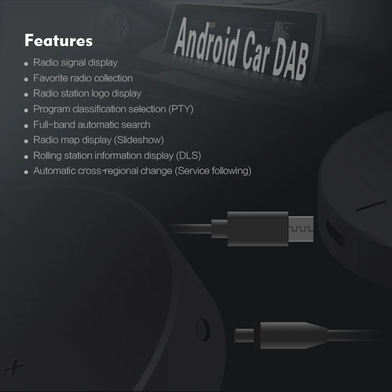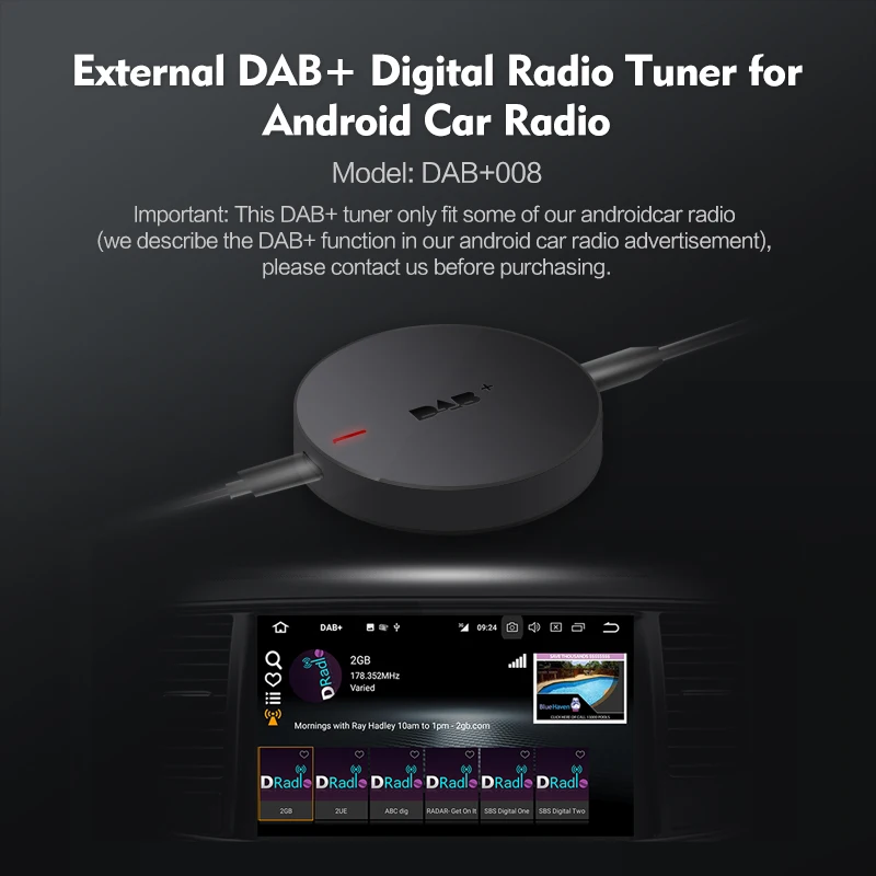 1. Автомобильный мультимедиа должен поддерживать функцию DAB. 2. Автомобильный мультимедиа должен быть оснащен системой Android (Android 5,1 и avove). 3. Приложение DAB должно быть предварительно установлено. 4. Из-за относительно короткой зоны покрытия сигналов DAB некоторые области могут найти меньшее количество радиопрограмм. 5. Подходит только для стран, у которых есть DAB сигнал: Австралия, Бельгия, Чехия, Дания, Франция, Германия, Gibraltar, Гонконг, Ирландия, Италия, Kuwait, Malta, Monaco, Netherlands, норвегия, Польша, Словения, Корея, Испания, Швеция, Швейцария, Великобритания. 6. Если предварительно установленное приложение автомобиля или приложение DAB, загруженное с Google Market, не совместимо, пожалуйста, свяжитесь с нами, чтобы получить файл APK.