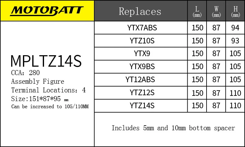 Тип батареи MPLTZ14S-P Напряжение 12 В CCA: 280 Емкость (1С) 4ач Вес: 0,82 кг Размеры (В/мм) L: 5,94 (151) W: 3,43 (87) H: 3,74 (95) TH: 4,13 (110) Сборка рисунок Терминал: 4 Клеммы: 2, M6x2.5 (часть # MPT2) Винты: 4, M6X7 (часть #2xMPS2) Шестигранный ключ: 1, 4x4 (часть # MPAK2) Терминал шапки: 2, 12x5,5 (часть #2xMPC2) Прокладка: 1*15 мм 1*10 мм, 1*5 мм EVA 147*84*10 мм/147*84*5