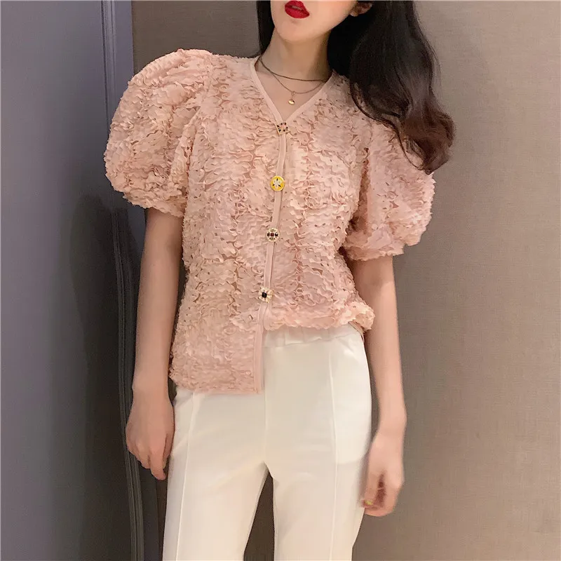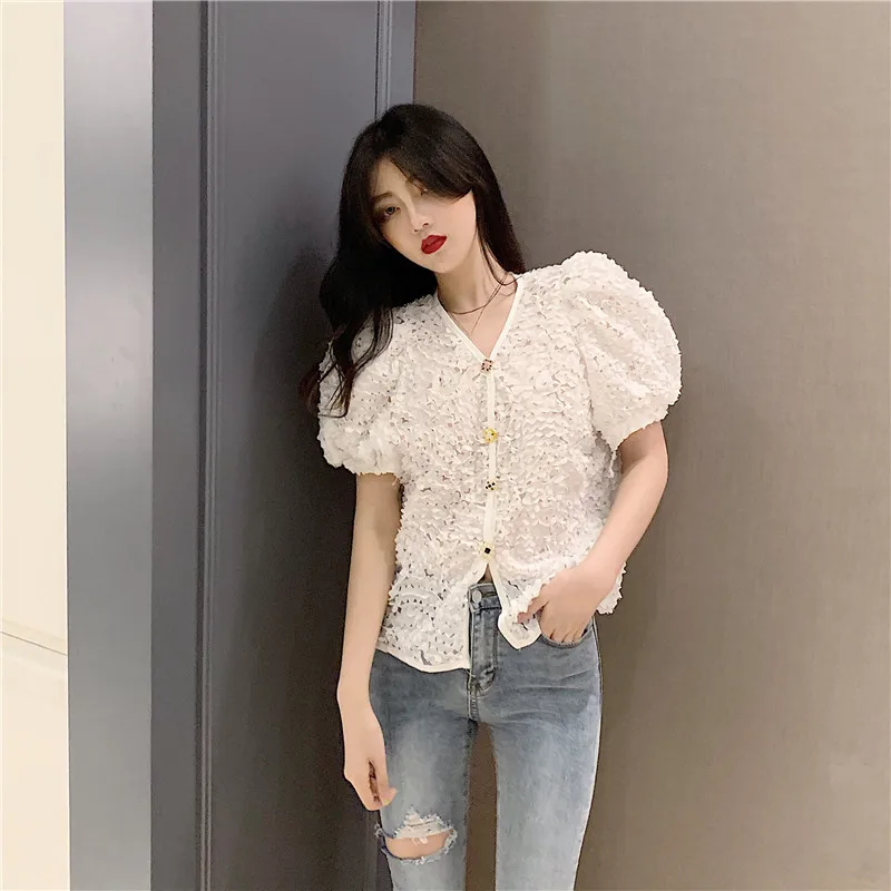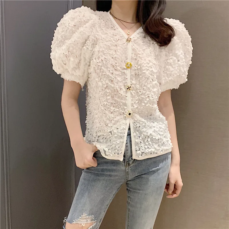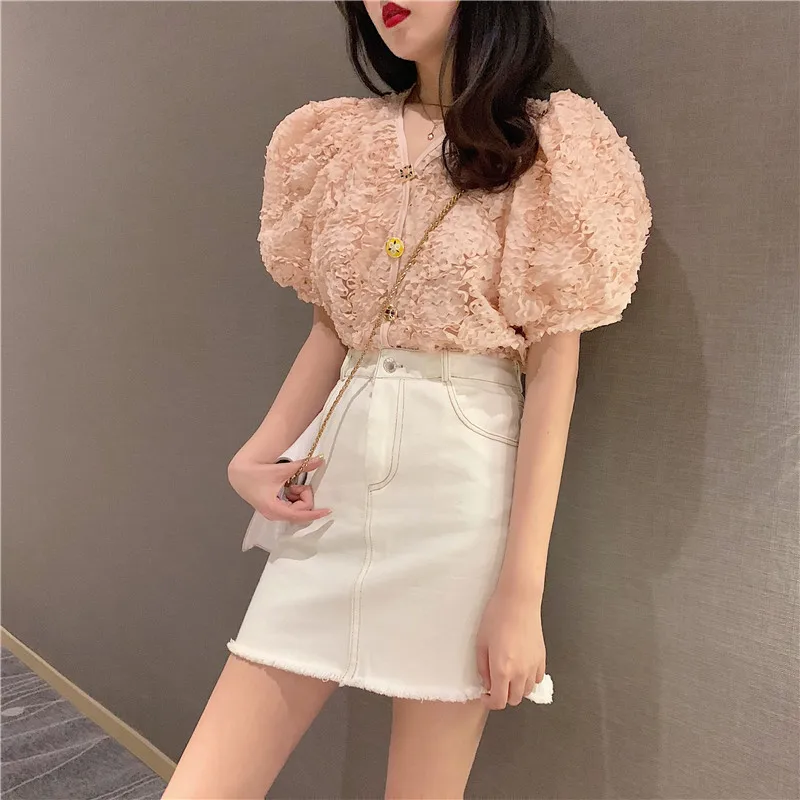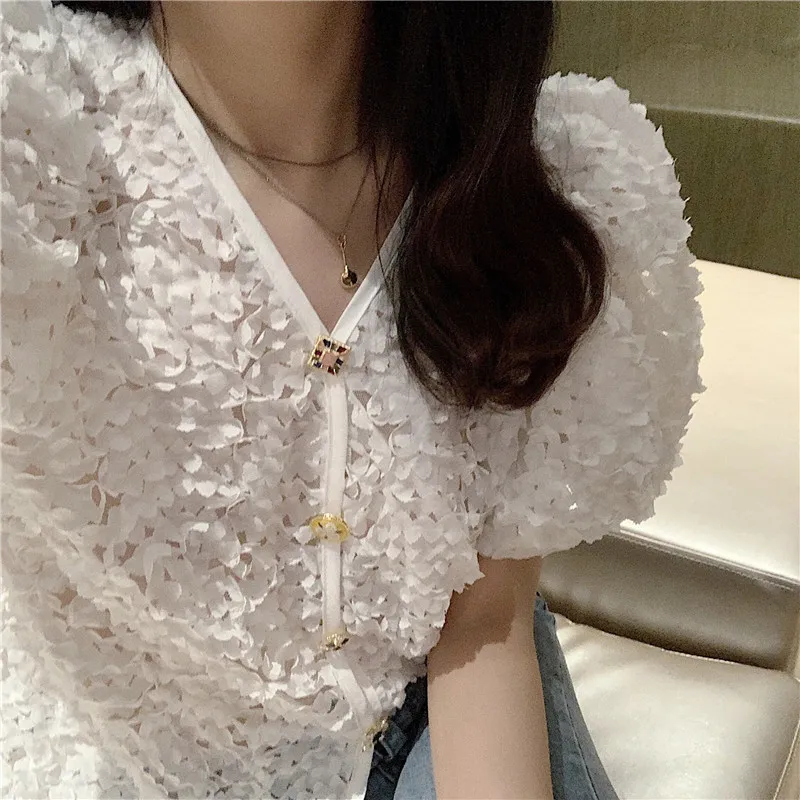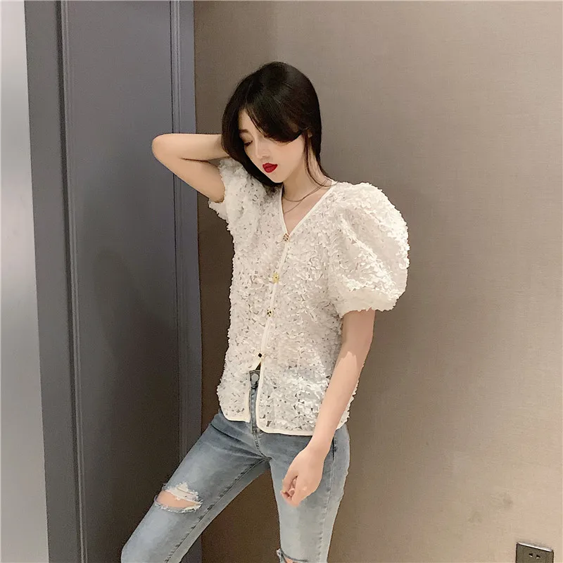 Шифоновая рубашка DA484, Элегантная универсальная Свободная блузка с вышивкой, кружевом, v-образным вырезом и короткими рукавами, лето 2020