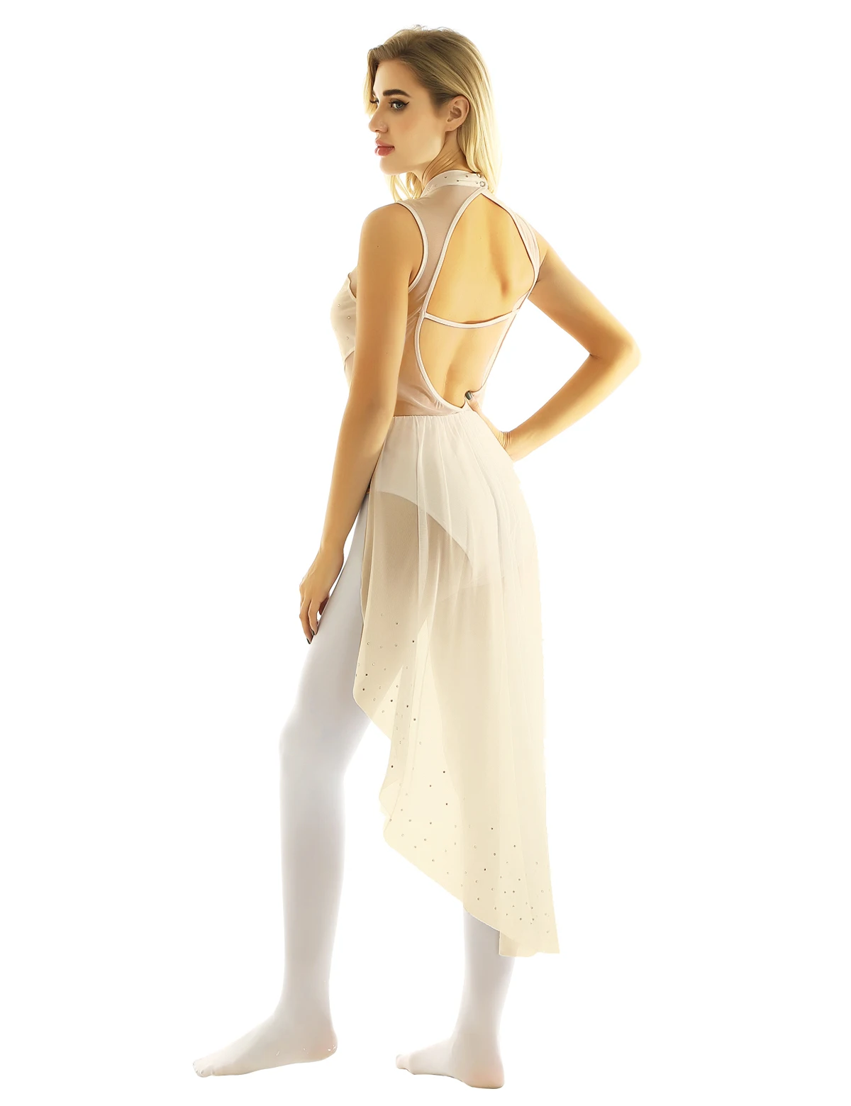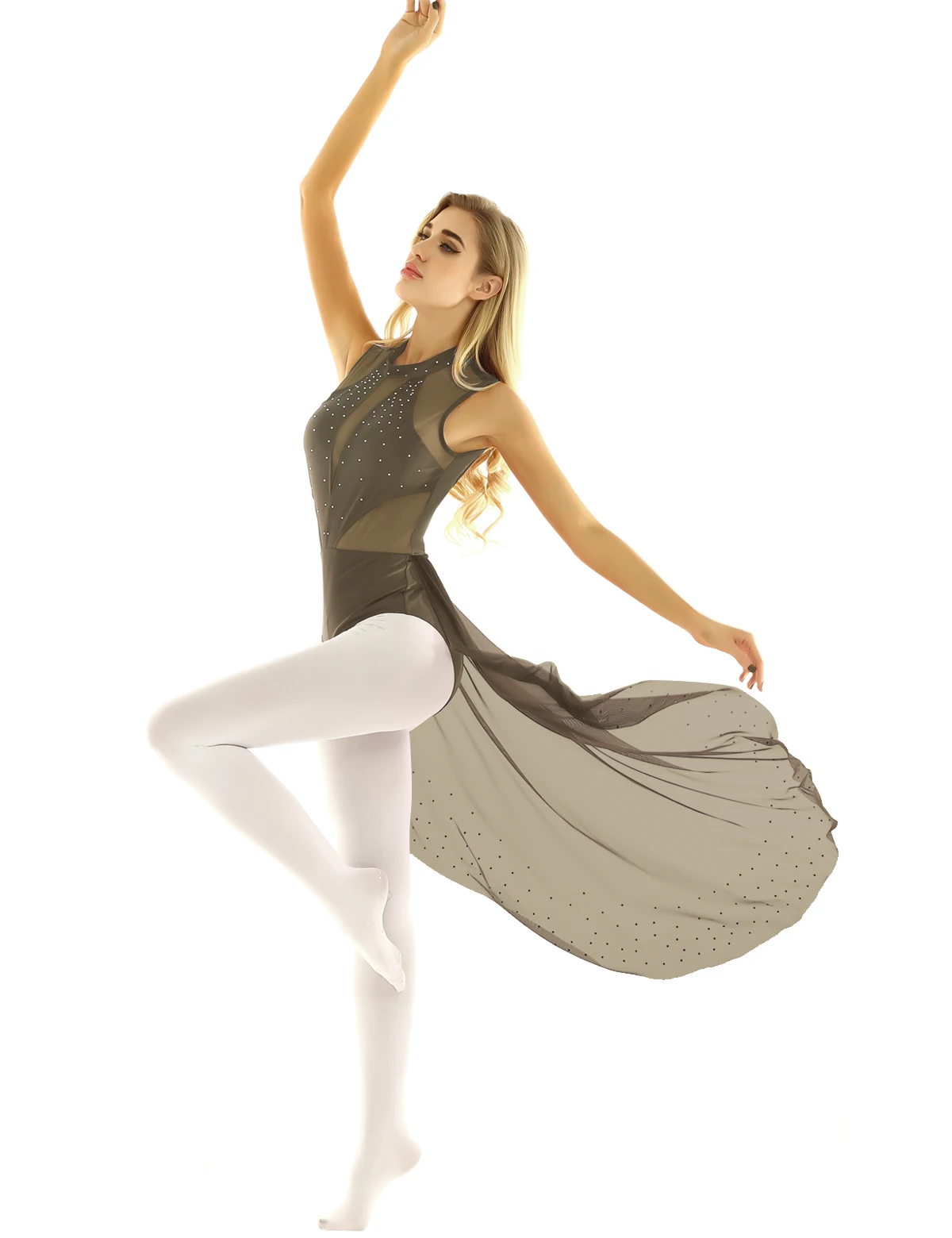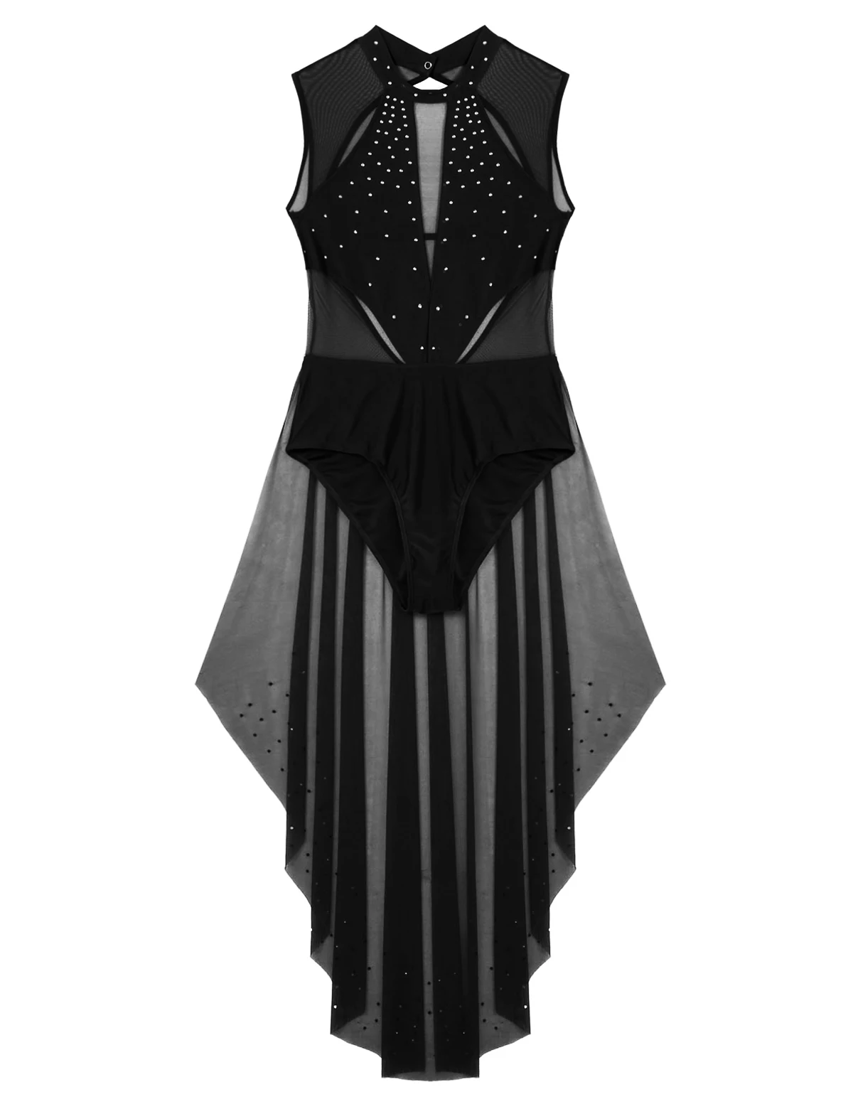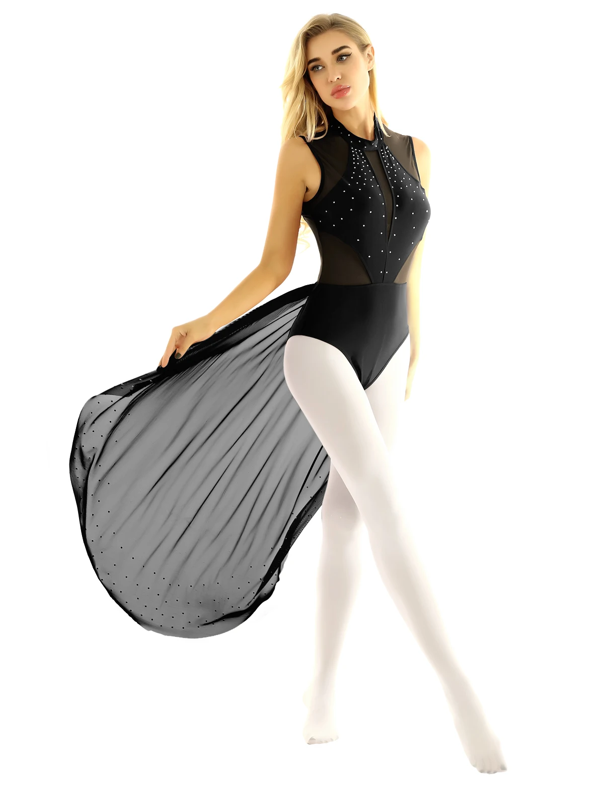 Женское цельнокроеное трико для танцев гимнастическое трико года, балетная одежда с застежкой. Лиф с круглым вырезом, без рукавов и открытой спиной из прозрачной сетки, украшенный блестящими стразами, придаст вам элегантный вид. Однослойная Асимметричная сетчатая юбка сзади на талии, Подол со стразами. Хорошая эластичная ткань, мягкая и удобная в носке. Подходит для танцевальных классов, гимнастическое упражнение, сценических выступлений, костюмов и т. д. Пожалуйста, внимательно сверьтесь с таблицей размеров ниже перед размещением заказа, ручная и машинная стирка.