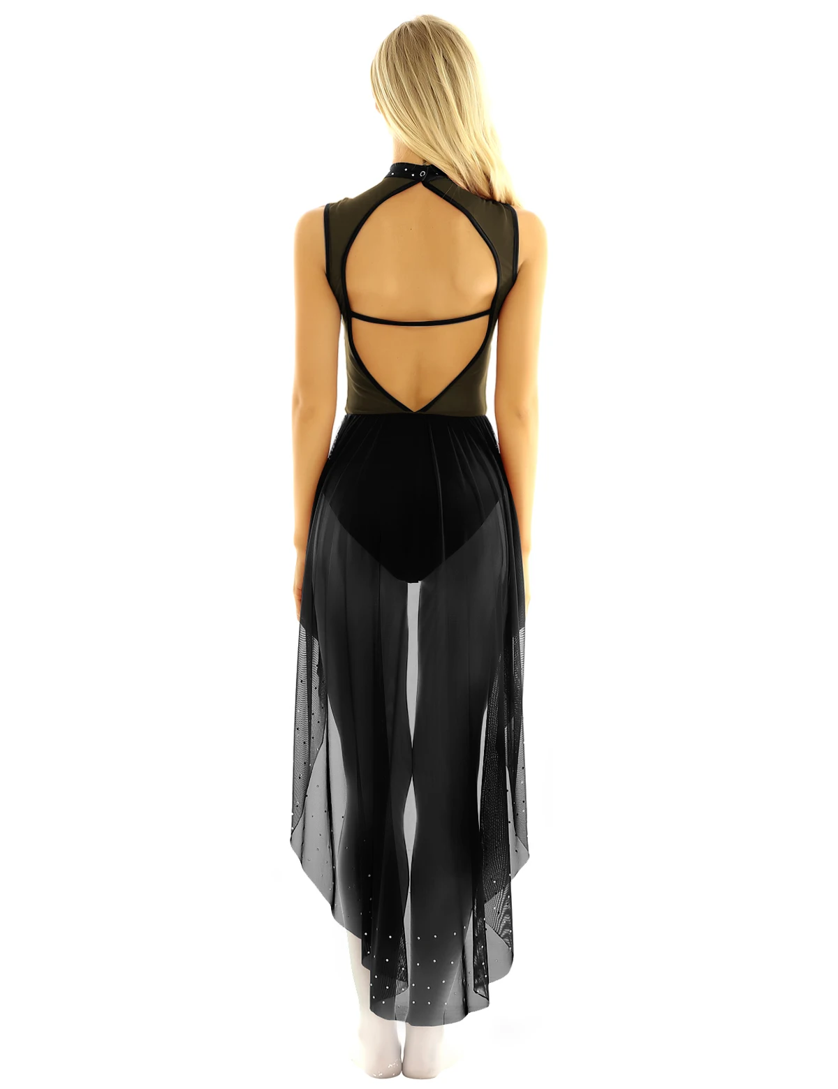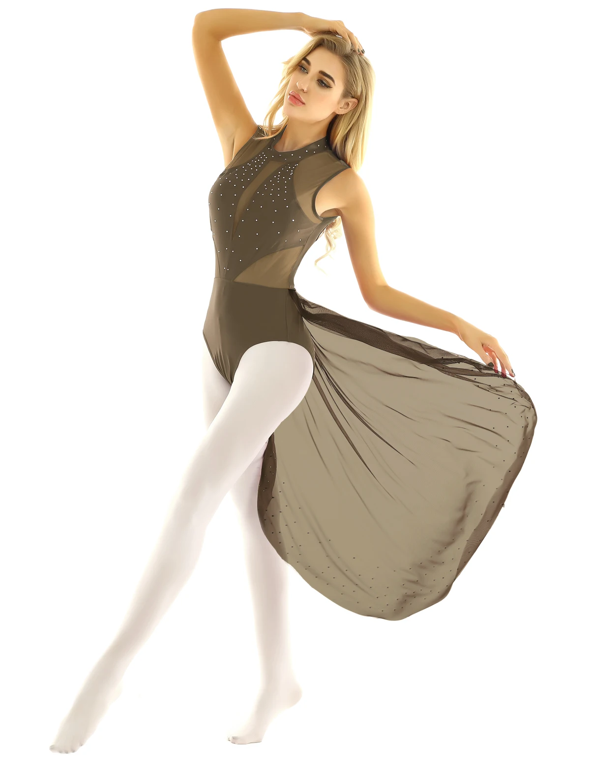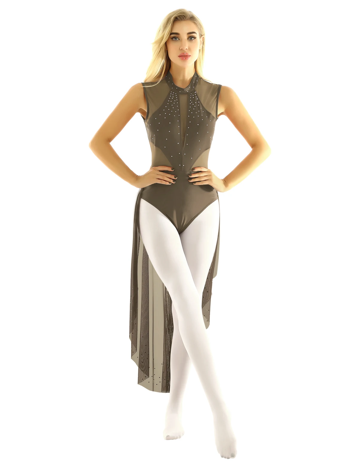 Женское цельнокроеное трико для танцев гимнастическое трико года, балетная одежда с застежкой. Лиф с круглым вырезом, без рукавов и открытой спиной из прозрачной сетки, украшенный блестящими стразами, придаст вам элегантный вид. Однослойная Асимметричная сетчатая юбка сзади на талии, Подол со стразами. Хорошая эластичная ткань, мягкая и удобная в носке. Подходит для танцевальных классов, гимнастическое упражнение, сценических выступлений, костюмов и т. д. Пожалуйста, внимательно сверьтесь с таблицей размеров ниже перед размещением заказа, ручная и машинная стирка.