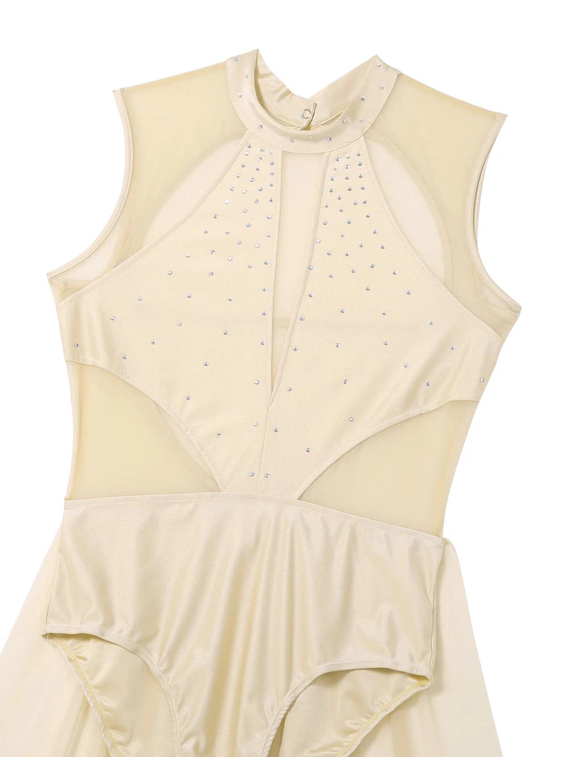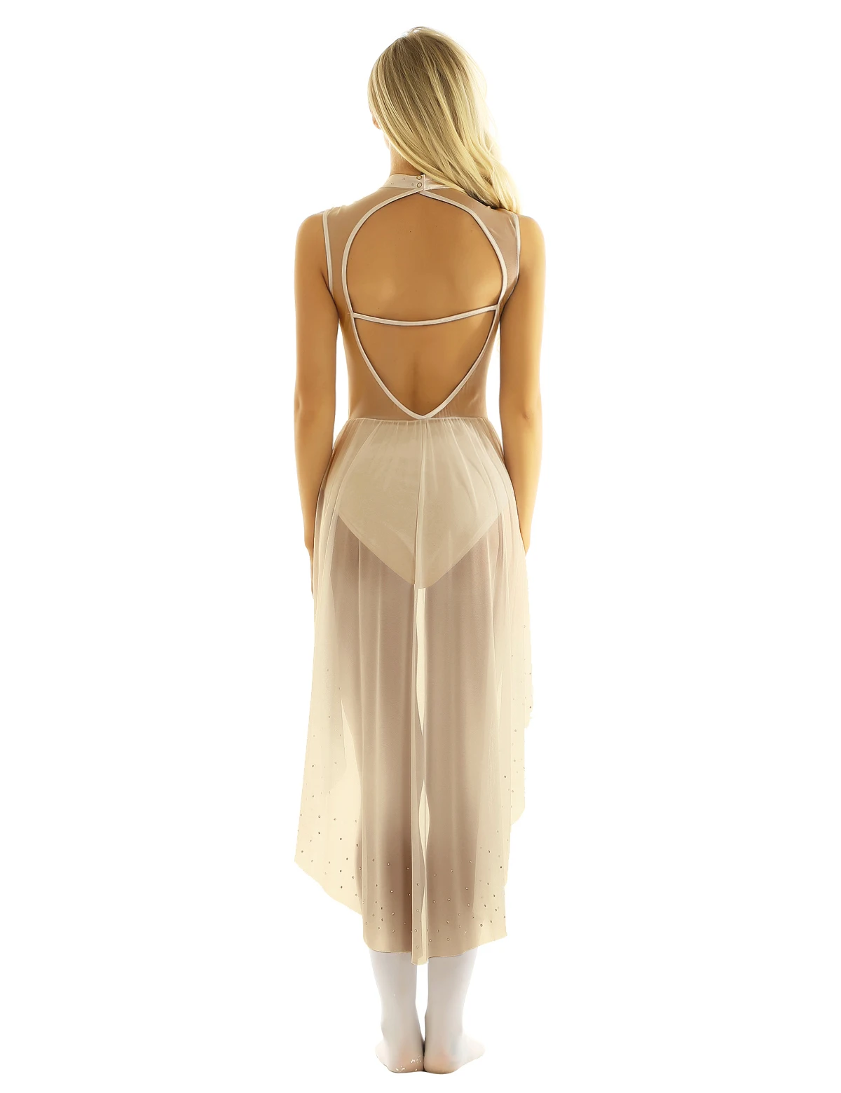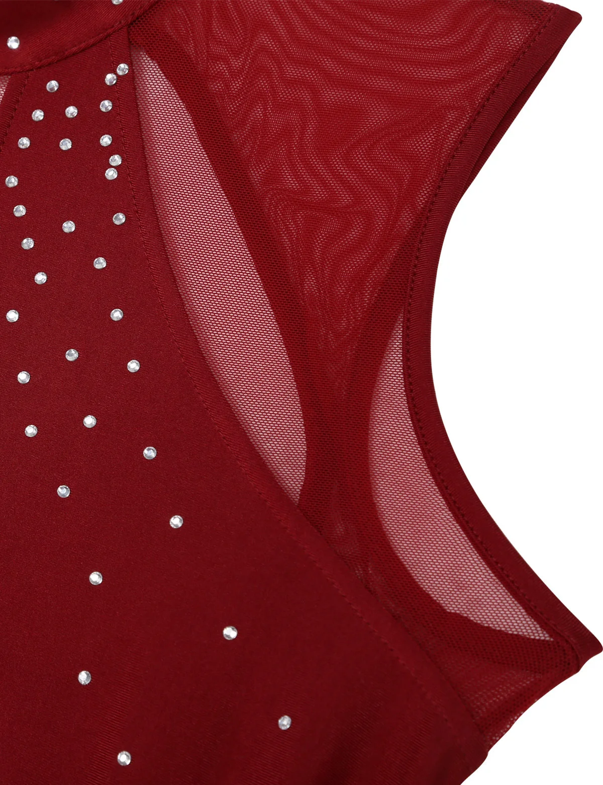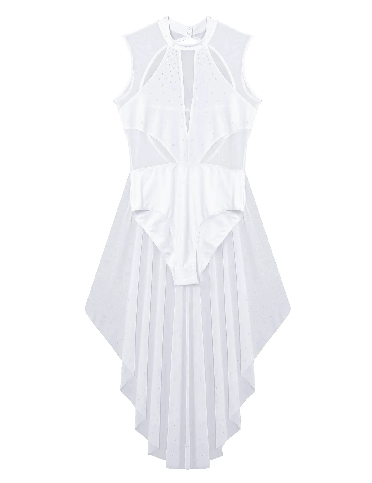 Женское цельнокроеное трико для танцев гимнастическое трико года, балетная одежда с застежкой. Лиф с круглым вырезом, без рукавов и открытой спиной из прозрачной сетки, украшенный блестящими стразами, придаст вам элегантный вид. Однослойная Асимметричная сетчатая юбка сзади на талии, Подол со стразами. Хорошая эластичная ткань, мягкая и удобная в носке. Подходит для танцевальных классов, гимнастическое упражнение, сценических выступлений, костюмов и т. д. Пожалуйста, внимательно сверьтесь с таблицей размеров ниже перед размещением заказа, ручная и машинная стирка.