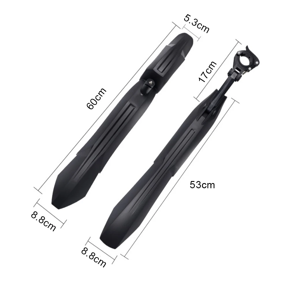 1. Материал: в основном PP пластик, нейлон, металл и т. д. 2. Цвет крыла: в основном черный 3. Размер: Пожалуйста, ознакомьтесь с графикой ниже 4. Вес нетто: прибл. 360 грамм 5. Крепление заднего крыла: подходит для труб диаметром 27,2-34,9 мм 6. Крепление переднего крыла: подходит для диаметра. 22-26 мм 7. Защита от грязи Лучшее использование: 24 ”, 26”, 27,5 ”, 29” MTB