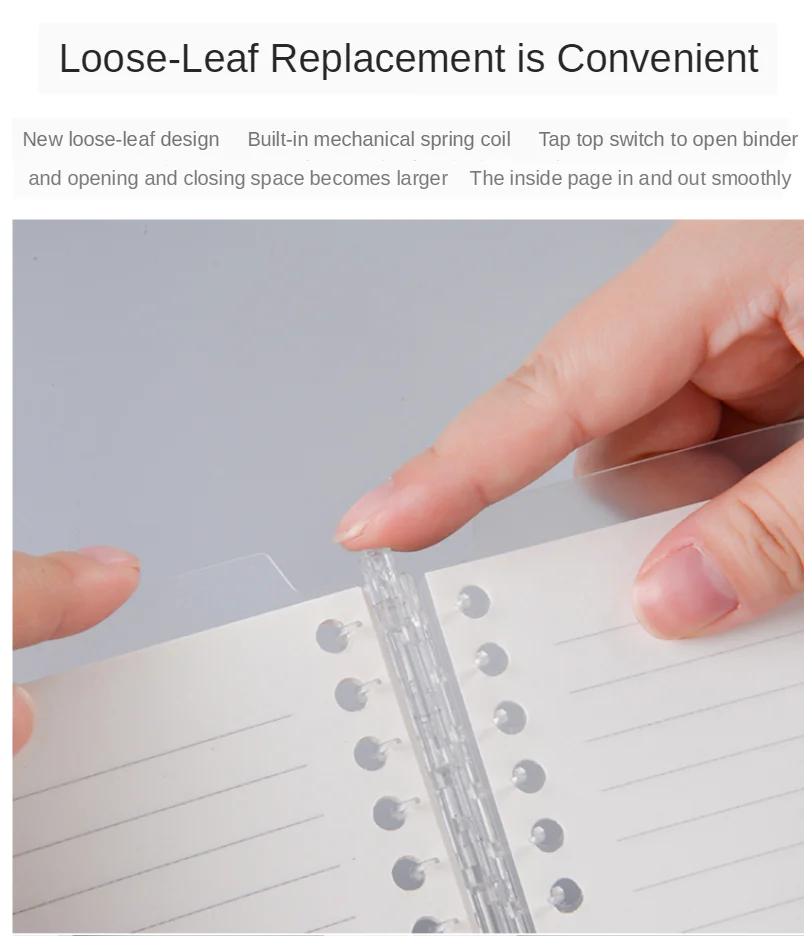* Запасной стержень сменный, новый дизайн, есть Встроенная механическая пружинная катушка внутри, нажмите верхний переключатель, чтобы открыть связующее, и открытие зазора становится больше, затем вы можете легко снимать страницы внутри или снаружи.