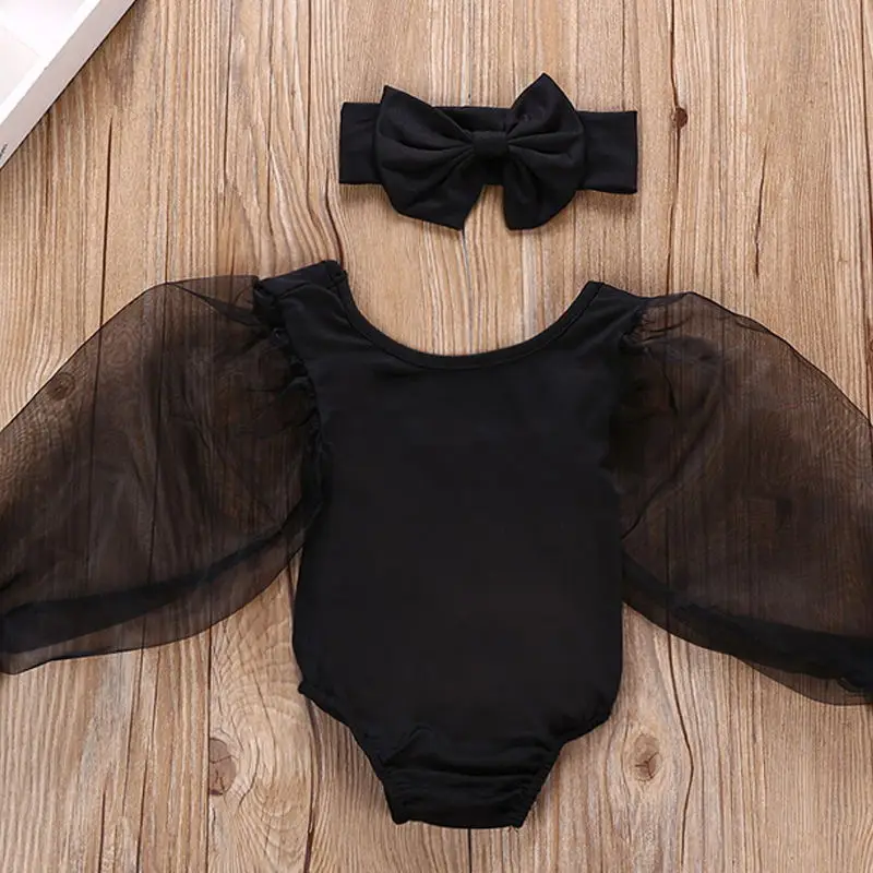 Одежда для новорожденных девочек кружевное прозрачное боди с открытыми плечами и длинными рукавами-фонариками, повязка на голову с бантом, хлопковый комплект из 2 предметов для малышей