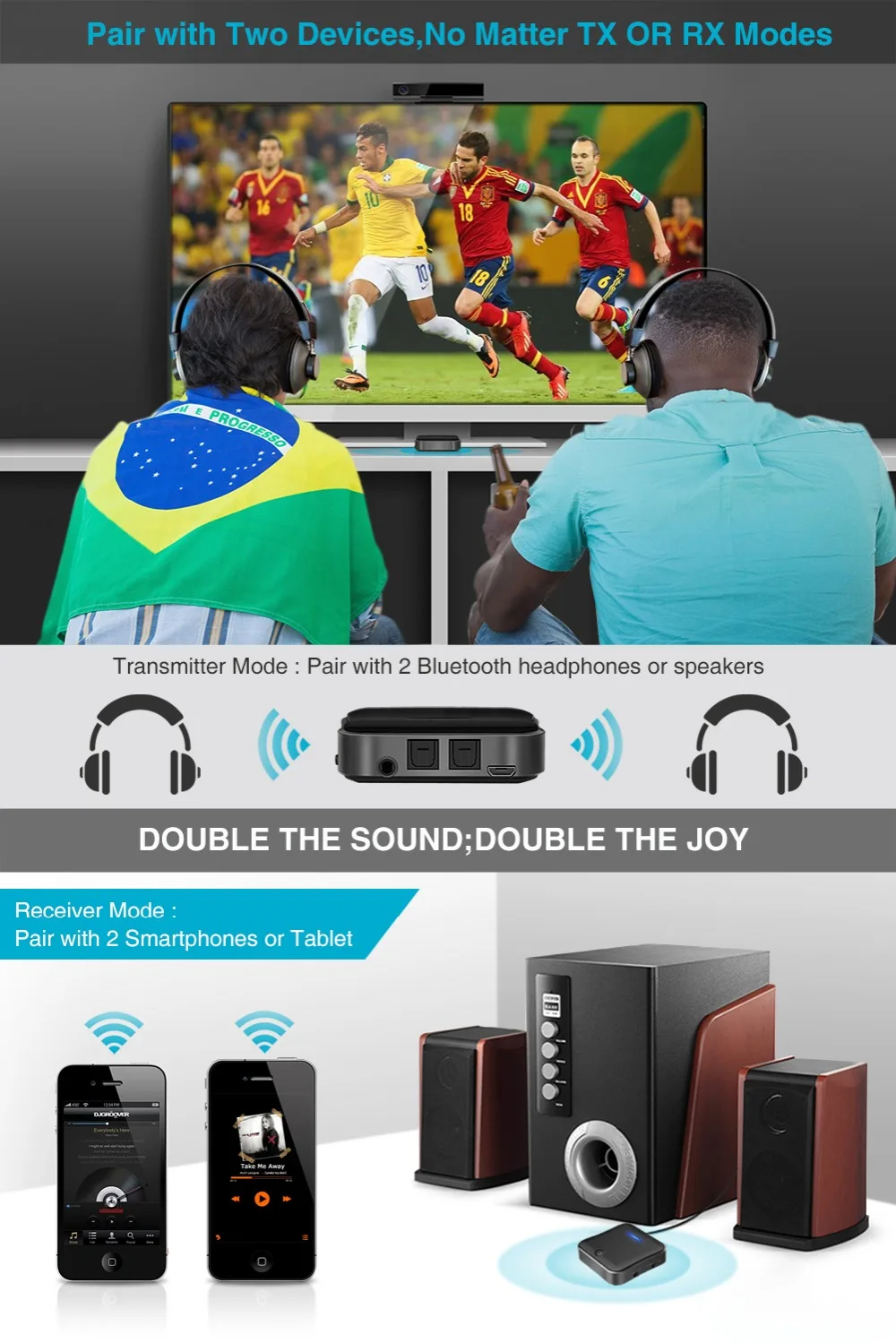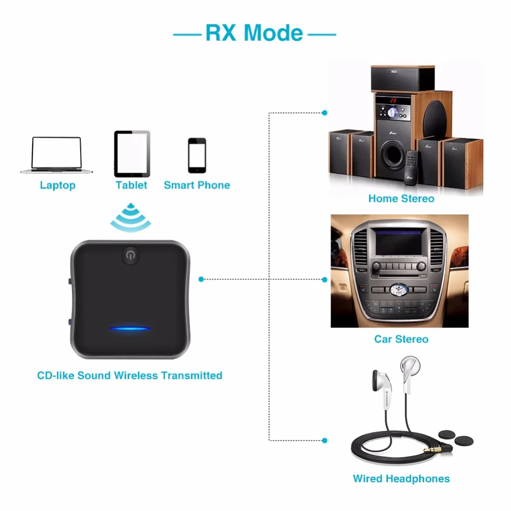 В режиме TX два bluetooth-наушника могут быть сопряжены сразу, чтобы родители могли смотреть в тишине и дать детям необходимый прорыв; В режиме RX два умных устройства могут быть сопряжены для воспроизведения различных песен. Запись 8 устройств и автоматическое повторное сопряжение с существующими парными устройствами.