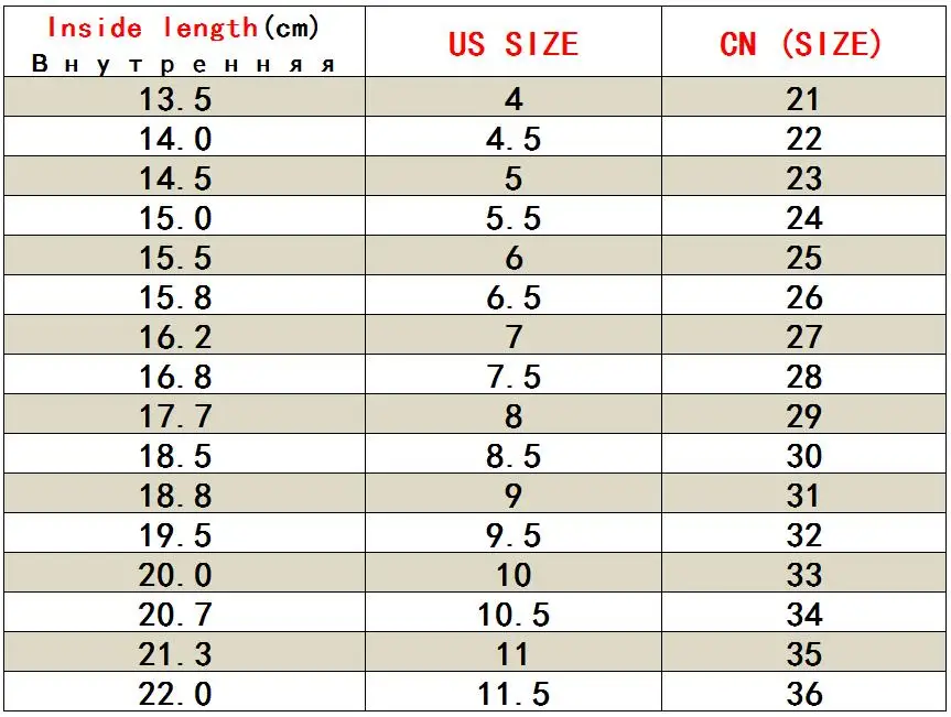 1: американский размер не является стандартным, просто удобно для вас делать заказ. Пожалуйста, выберите размер в зависимости от внутренней длины. В обуви есть только китайские размеры. При получении товара, пожалуйста, обратитесь к китайским размерам 2: Мы не вернем вам деньги, если вы выбрали неправильный размер, пожалуйста, внимательно выбирайте размер. 3: способ выбрать идеальную обувь для ваших детей. Длина стопы + 1 см = Внутренняя длина. Пожалуйста, измерьте длину стопы вашего ребенка, как показано ниже. если длина стопы 11,5 см, Вы можете добавить 1 см. это означает, что выбирайте длину внутри 12,5 см. Спасибо за поддержку. 4: из-за различных методов измерения может быть погрешность около 1 см, это нормально.
