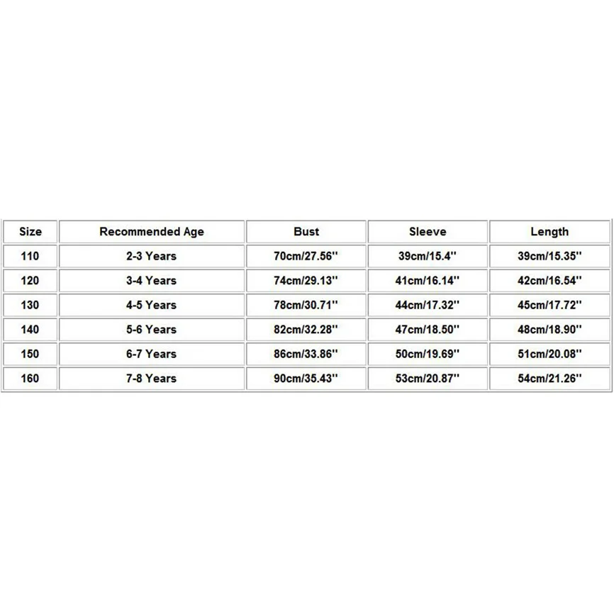 Размеры Рекомендуемый возраст Обхват груди Рукава Длина 110 От 2 до 3 лет 70 см/27,56'' 39 см/15,4'' 39 см/15,35'' 120 От 3 до 4 лет 74 см/29,13'' 41 см/16,14'' 42 см/16,54'' 130 От 4 до 5 лет 78 см/30,71'' 44 см/17,32'' 45 см/17,72'' 140 От 5 до 6 лет 82 см/32,28'' 47 см/18,50'' 48 см/18,90'' 150 От 6 до 7 лет 86 см/33,86'' 50 см/19,69'' 51 см/20,08'' 160 От 7 до 8 лет 90 см/35,43'' 53 см/20,87'' 54 см/21,26''