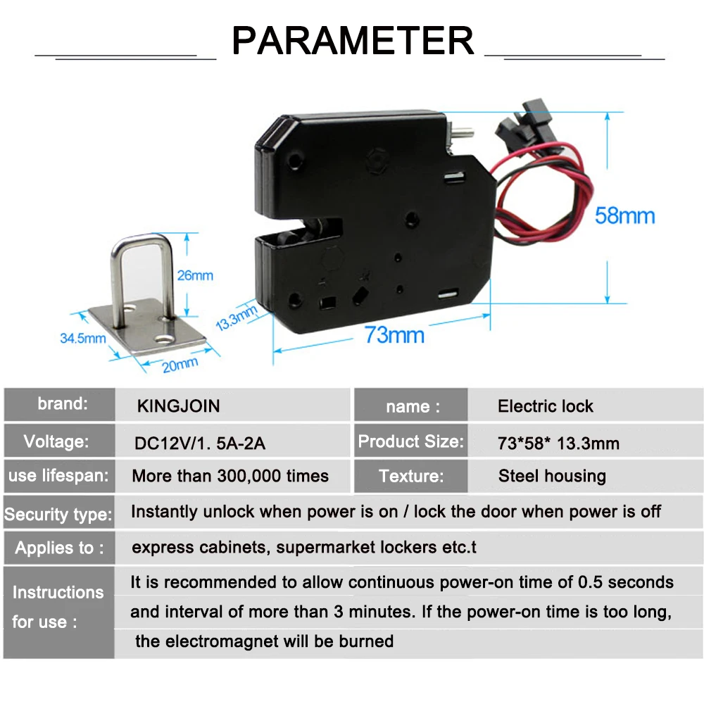 Электрический замок в основном используется из углеродистой стали для внутреннего материала. Прочный и безопасный в использовании. Безопасность: защелкивающийся крючок может выдерживать тягу 150 кг, не будет очевидным постоянное деформация, ударопрочный, анти-посторонний. Компактный, простой в установке, без левого, правого, переднего, обратного бокового ограничения, и позволяет механическое положение разблокировки ресниц. Само эластичный дизайн: эластичность регулируется, подходит для веса 0,5 ~ 4 кг двери. Применение: шкафчики для доставки, Холодильный шкаф, почта или ящик для газет, шкафчик для самостоятельного обслуживания, книжный счетчик, шкаф для переодевания и т. д.