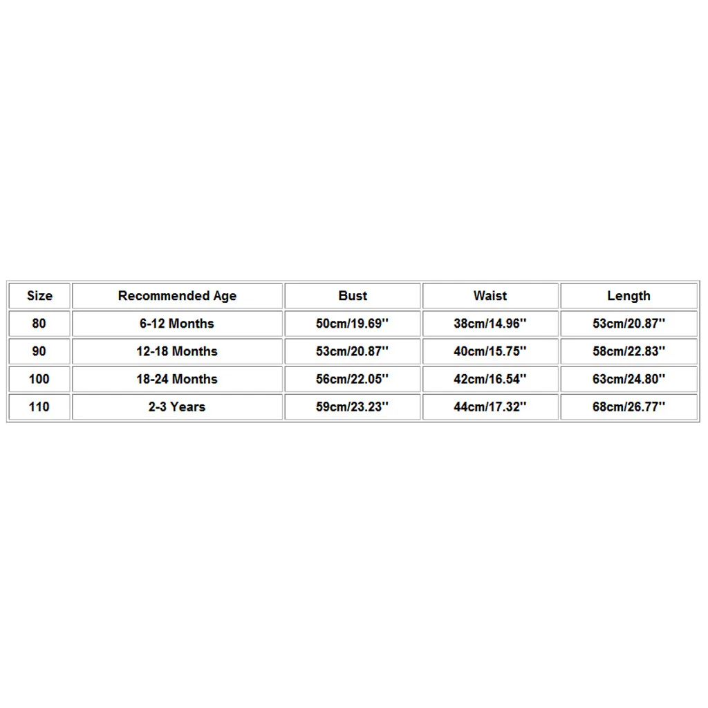 Размеры Рекомендуемый возраст Обхват груди Обхват талии Длина 80 6-12 месяцев 50 см/19,69'' 38 см/14,96'' 53 см/20,87'' 90 12-18 месяцев 53 см/20,87'' 40 см/15,75'' 58 см/22,83'' 100 18-24 месяцев 56 см/22,05'' 42 см/16,54'' 63 см/24,80'' 110 От 2 до 3 лет 59 см/23,23'' 44 см/17,32'' 68 см/26,77''