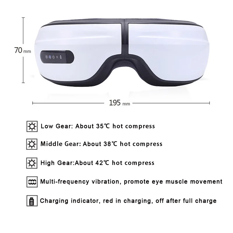 1. Изготовлен из высококачественного материала, безопасный, прочный, экологически чистый и безвредный для вашей кожи. 2. Горячая компрессия с постоянной температурой, активирует кровообращение, поглощение питательных веществ в глазах и повышает эластичность кожи. 3. Вибрационный массаж, вибрирует группу мышц глаз, восстанавливает гибкость цилиарной мышцы, улучшает усталость глаз. 4. Идеально подходит для уменьшения тонких линий, против морщин, выцветания темного круга, выцветания мешков для глаз и других проблем с глазами. 5. Подходит для школьников, компьютерных операторов, людей, которые используют глаза в течение длительного времени. 6. Складная конструкция, легко и удобно носить с собой в путешествии.