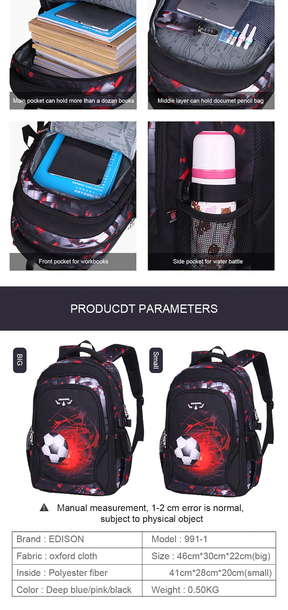 Школьные сумки для подростков Эдисона, модный Ультра-светильник, детский школьный рюкзак с рисунком, рюкзаки для мальчиков и девочек Большой размер: 46*30*22 см Маленький размер: 41*28*20 см Подходит для возраста: маленький: 6-8 лет; Большой: 9-12 лет Категория товара: mochila escolar,mochila infantil, школьная сумка Характеристики продукта: осветление, водонепроницаемость, большая емкость Упаковочный лист: 1 * школьная сумка 1 * чехол-карандаш 1 * Подарочная коробка для канцелярских принадлежностей Покупатель вопросы и ответы Подходит для Тетрадь A4? --- Да Ноутбук подходит? ------- Да Для школы и офиса? --- Да Для Прогулок? --------- да Это Водонепроницаемый? -------- Да Можно стирать? ------- да
