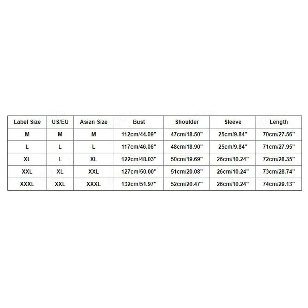 Модели реального товара могут немного отличаться от моделейРазмер этикетки США/ЕС Азиатский размер Бюст Плечо Рукав Длина М М М 112 см/44,09'' 47 см/18,50'' 25 см/9,84'' 70 см/27,56'' L L L 117 см/46,06'' 48 см/18,90'' 25 см/9,84'' 71 см/27,95'' XL L XL 122 см/48,03'' 50 см/19,69'' 26 см/10,24'' 72 см/28,35'' XXL XL XXL 127 см/50,00'' 51 см/20,08'' 26 см/10,24'' 73 см/28,74'' XХХL XXL XХХL 132 см/51,97'' 52 см/20,47'' 26 см/10,24'' 74 см/29,13''