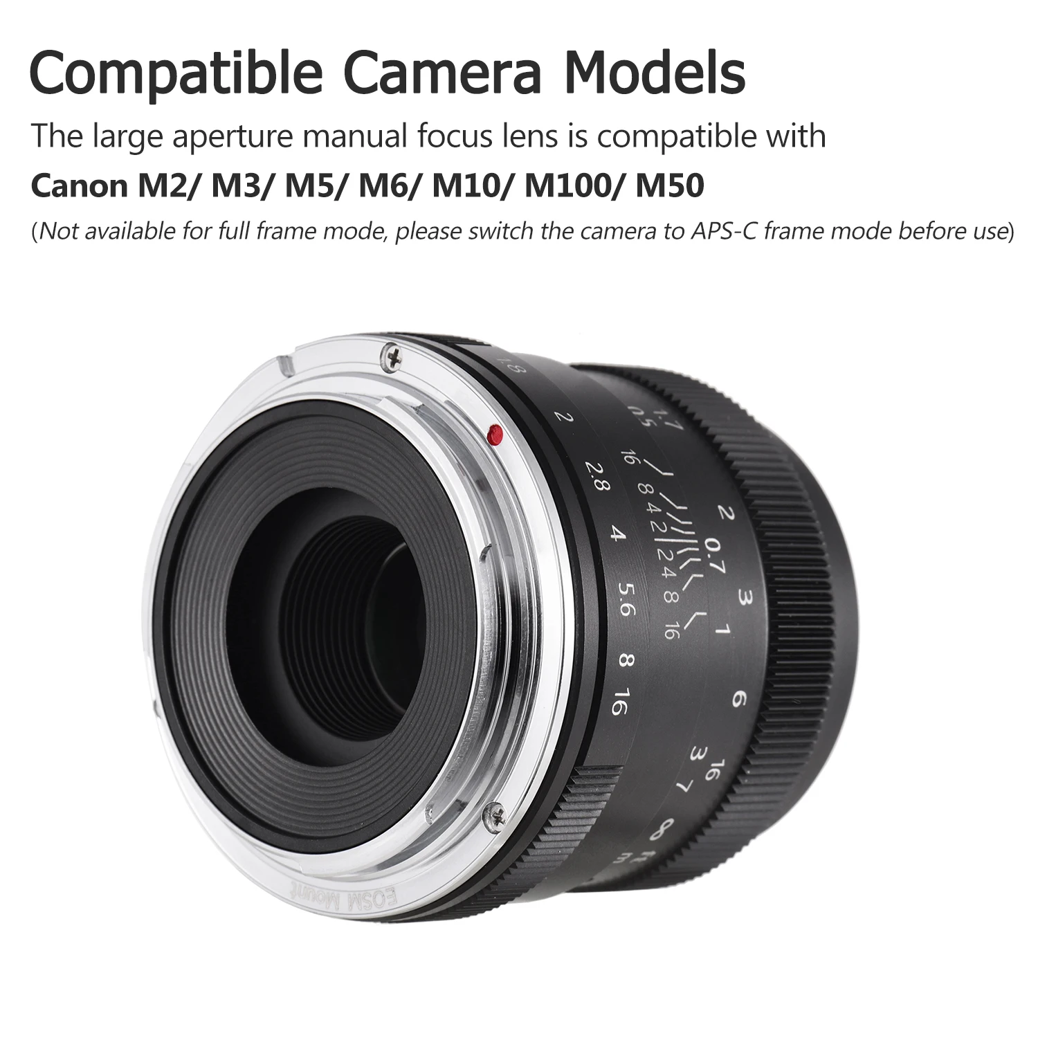Объектив с ручной фокусировкой, ручная регулировка диафрагмы и фокусного расстояния. В наличии для APS-C рамка ILDC camera, совместимый с Canon EOS-M крепление камеры. (См. Спецификацию для подробных моделей.)