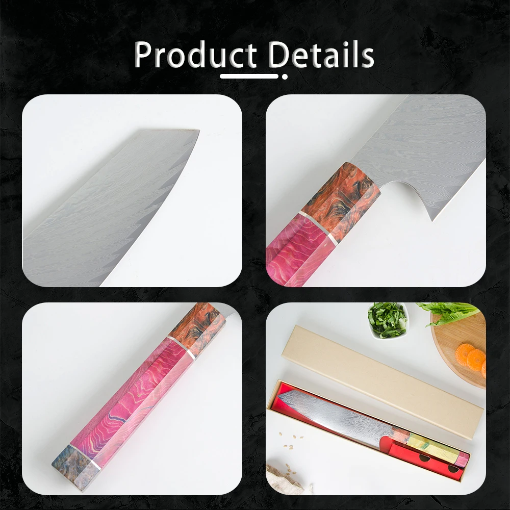 Материал: VG10 Дамасская сталь. Ручка: ручные затвердевшие деревянные ручки, жесткие, термостойкие, красивые, каждая ручка уникальна. Характеристики: острый и прочный; Супер антикоррозийный; Светильник с энергией. Уровень резкости: Острая Бритва Ручные затвердевшие деревянные ручки, Каждая восьмиугольная Геометрическая ручка отличается. Я не уверен, какой цвет вы получите, Но я считаю, что когда вы получите его, это будет сюрприз! Если вы человек, который любит сюрпризы, пожалуйста, не стесняйтесь покупать его.