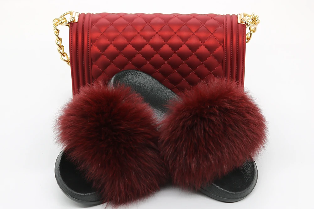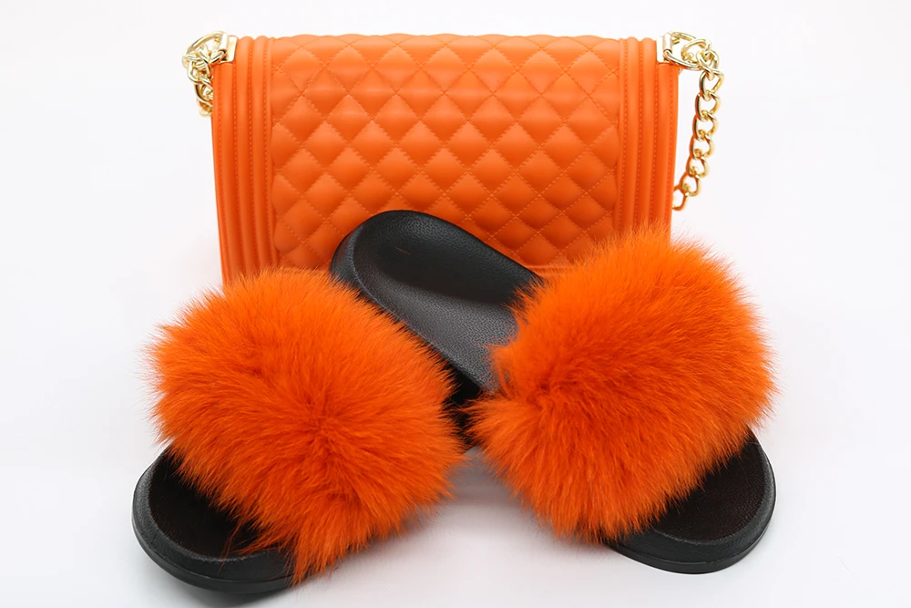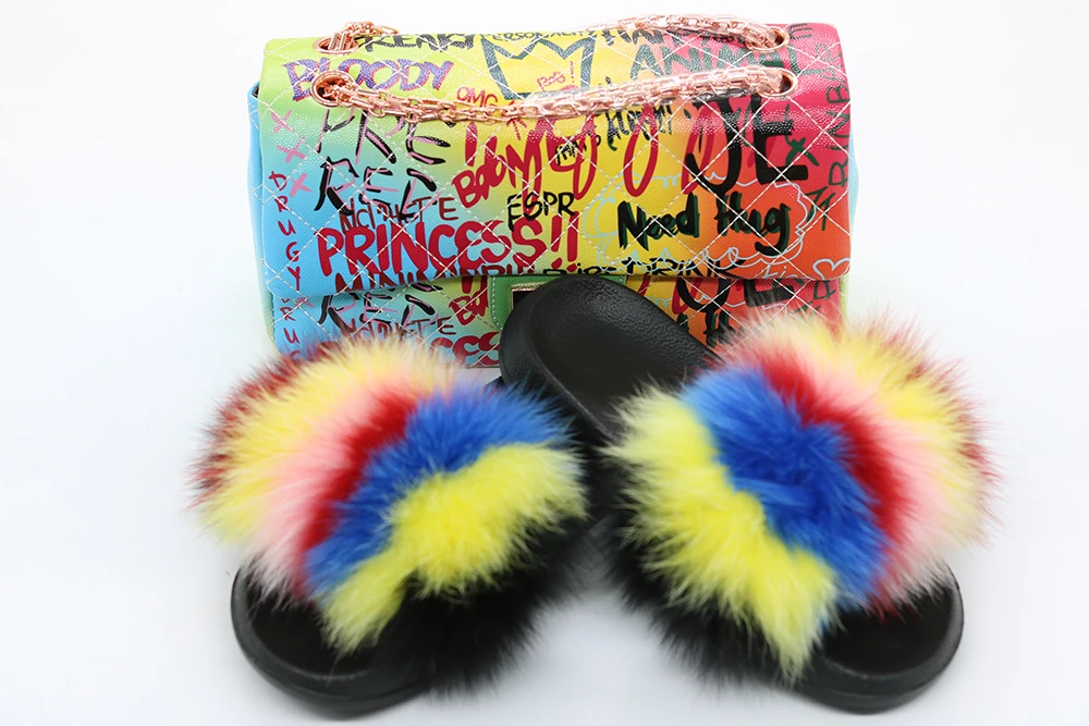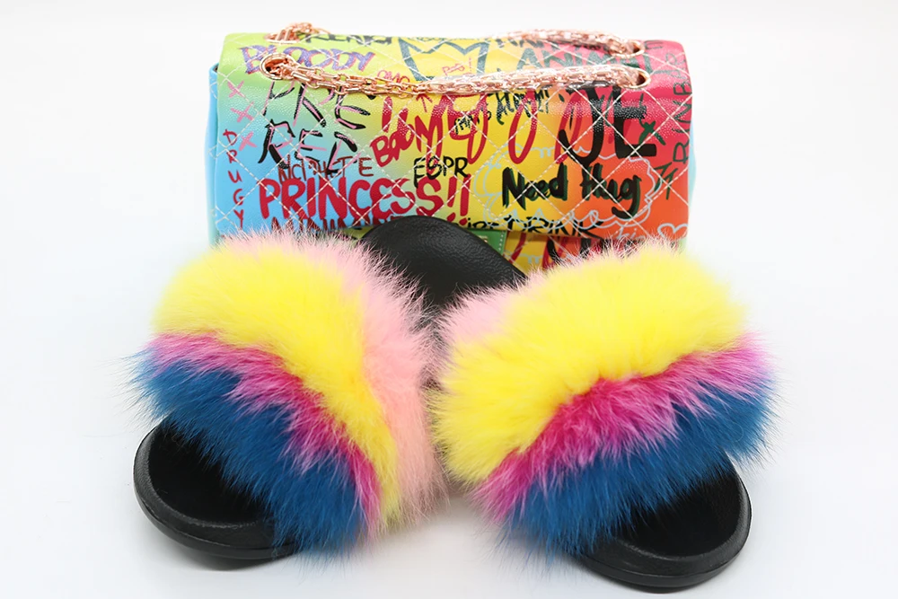 Женские меховые тапочки: 100% тапочки из лисьего меха Радужная ПВХ сумка: желе граффити модный бренд сумка набор