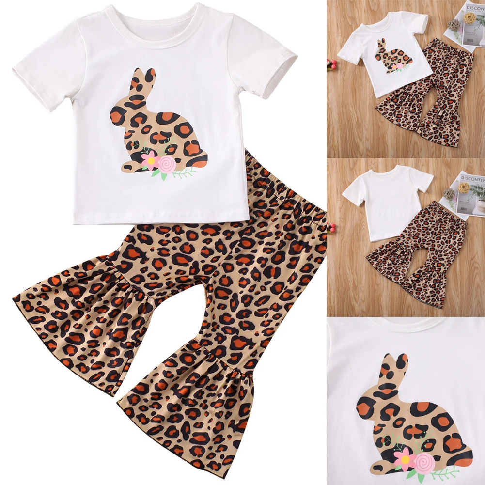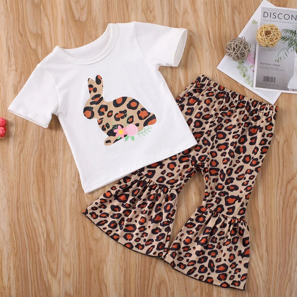 Бесплатная доставка, одежда для маленьких девочек, пасхальный пуловер с геометрическим рисунком, футболки, расклешенные брюки с леопардовым принтом, 2 шт., Одежда для новорожденных детей
