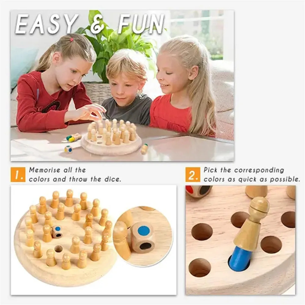 1 × детский Шахматный набор с памятью. (1 круглая деревянная основа с 24 отверстиями, 1 многоцветная деревянная игральная кость, 24 деревянных колышка (4x Белый, 4x зеленый, 4x Желтый, 4x синий, 4x черный, 4x красный)