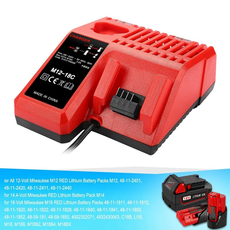 Для 18-вольтовых литиевых аккумуляторов Milwaukee M18 RED 48-11-1811, 48-11-1815, 48-11-1820, 48-11-1822, 48-11-1840, 48-11-1841, 48-11-1850, 48-11-1852, 48-59-181, 48-59-1850, 4932352071, 4932430063, c18B, Li18, M18, M18B, M18B2, M18B4, M18BX