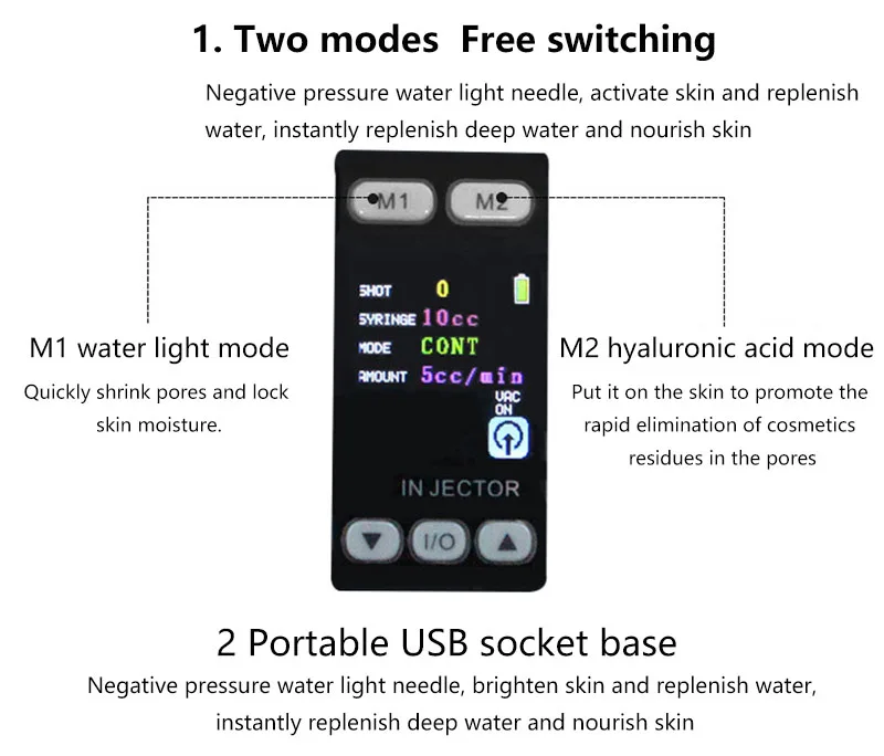 Технические характеристики Мощность: Батарея встроен литий-полимерный Батарея (7,4 V, 850 мА · ч) Зарядное устройство: Адаптер Вход: 110 ~ 240V 50/60Hz Выход AC/DC 8,4 V 500mA Max Продолжительность: использование отрицательного давления до 2000 раз. Потребляемая мощность: 4 Вт Материал: ABS (основная машина, ручка отрицательного давления, Зарядная база), PC (держатель шприца, фильтр), Никелированная (поршень шприца), силиконовая трубка (трубка отрицательного давления) Дисплей: 1,5 дюймовый цветной OLED Питание: кнопка переключения или автоматическое выключение в течение 5 минут. Режим: непрерывный, доза Установка инъекций: 5 уровней (непрерывный), 6 уровней (доза) Weihgt: основной корпус 220 г (включая держатель шприца), ручка отрицательного давления 100 г Размеры: 153x38x38 мм (основной корпус), 170x70x48 мм (ручка отрицательного давления) Функция: --- Омоложение кожи, удаление морщин и удаление пигментации --- Подтяжка кожи, улучшение метаболизма кожи, защита от старения --- Активация коллагеновых клеток, Повышение эластичности и блеска кожи --- Удаляет тонкие линии лица и вороньи лапы, простые линии слов и т. д. Преимущество: --- Применяется для эндогенной и экзогенной инъекции --- Технология инъекций, которая может ускорить процесс обработки --- Простота в эксплуатации, отсутствие побочных эффектов, но значительный эффект --- Регулируемая глубина впрыска, дозы, скорость и интенсивность всасывания. --- Технология защиты от обратного потока для лекарств и крови. ---- Стимулирует кожу для самозаживления, способствует метаболизму кожи