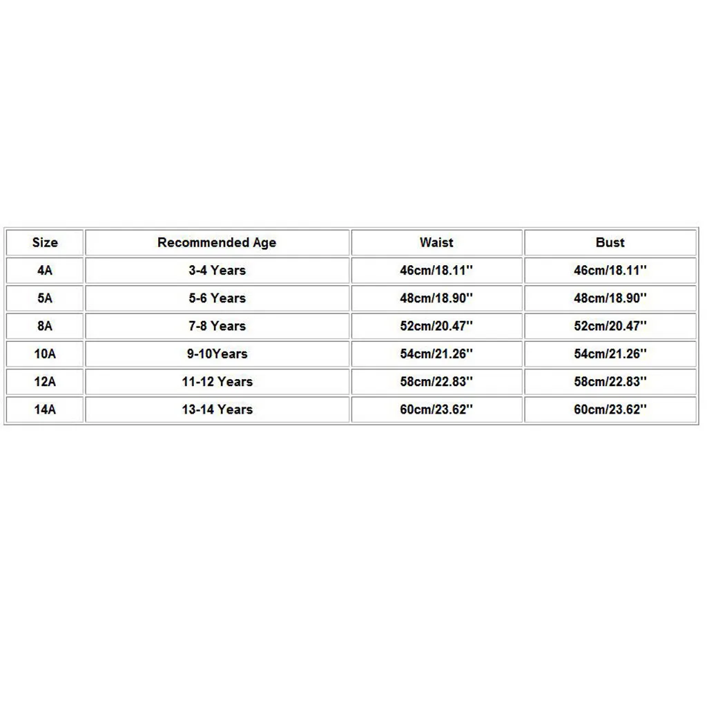Размеры Рекомендуемый возраст Талия Бюст 4A От 3 до 4 лет 46 см/18,11 дюйма 46 см/18,11 дюйма 5А От 5 до 6 лет 48 см/18,90 дюйма 48 см/18,90 дюйма 8A От 7 до 8 лет 52 см/20,47 дюйма 52 см/20,47 дюйма 10А 9-10 лет 54 см/21,26 дюйма 54 см/21,26 дюйма 12А 11-12 лет 58 см/22,83 дюйма 58 см/22,83 дюйма 14а 13-14 лет 60 см/23,62 дюйма 60 см/23,62 дюйма